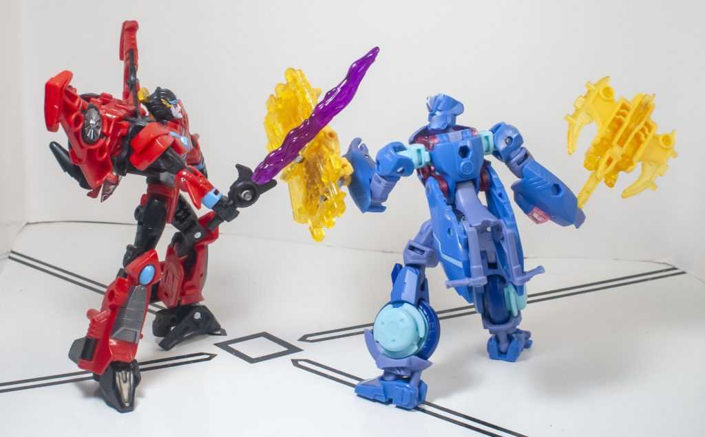 I’ve been giving her Netflix Optimus Prime’s Eneraxe and Shieldron Battlemasters, because they suit IDW1 Chromia more than the Ninja stars, and she’s got a convenient 5-millimeter port on either forearm that the shield can clip onto, though its weight means it sometimes wriggles out of the socket.