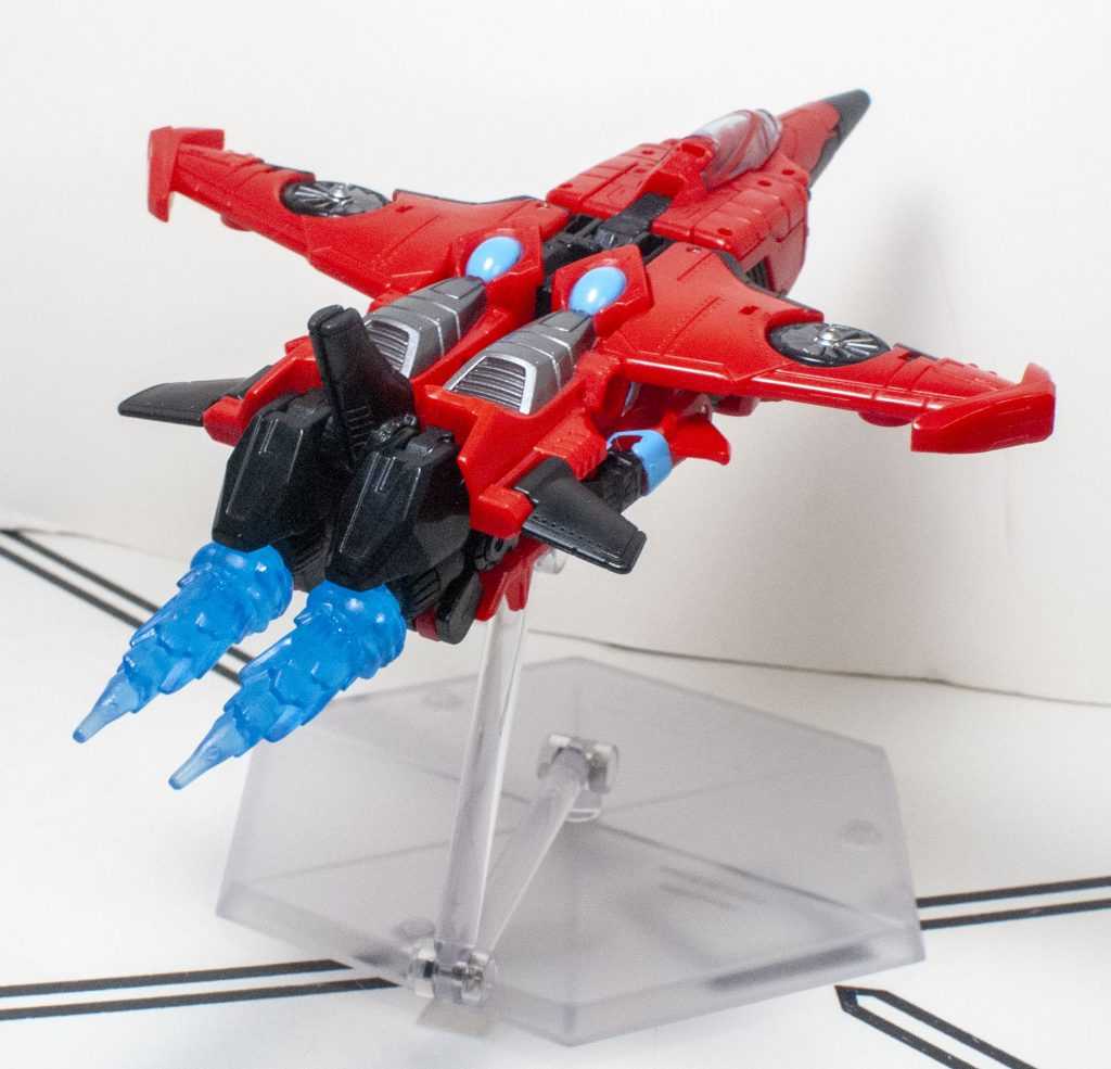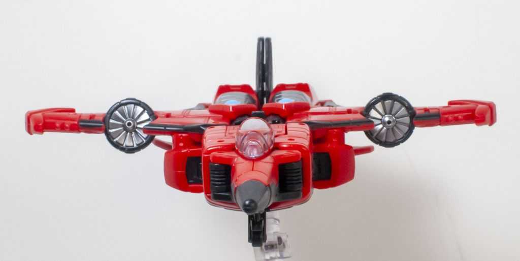 In terms of colors, this is the mode where her gradual design shift to more red and less black has become most evident, as red’s now her primary color, with black basically being an accent color, along with those same bits of silver and blue, and a clear cockpit. It’s a good shade of red, though, and it highlights the newly-present metal riveting details across the jet’s body really well.