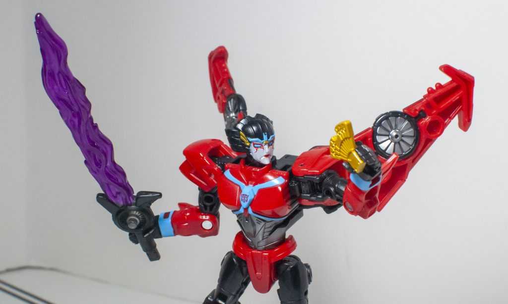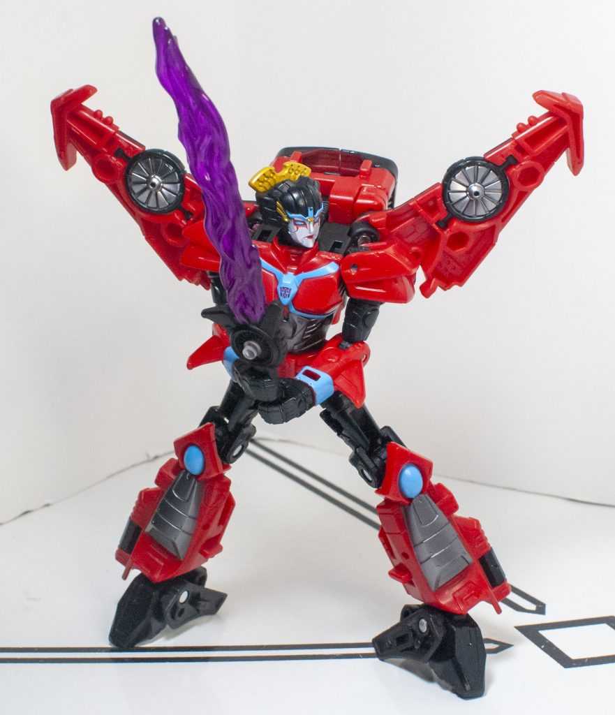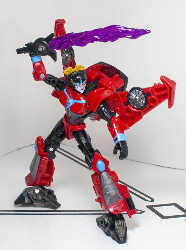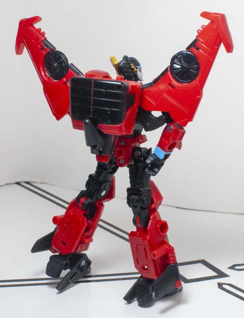 When it comes to articulation, firstly, and most importantly, yes, she has wrist swivels. Since her whole deal is that she’s a swordswoman, this is very important, and the Titans Return one didn’t have them, nor, I hear, did the Robots in Disguise Warrior (the original did). Beyond that, she’s got a standard set of Legacy bends and swivels, plus a few extras, like transformation joints giving her “toe” articulation, plus the ability for her wings to both flare out diagonally, and a bit backwards (again, she can do both to a higher degree if her backpack is popped off). One thing that does bug me, though, is the sculpted “collar” around her neck, because it slightly blocks her ball-jointed head articulation via collisions with her chin, but it’s very minor.