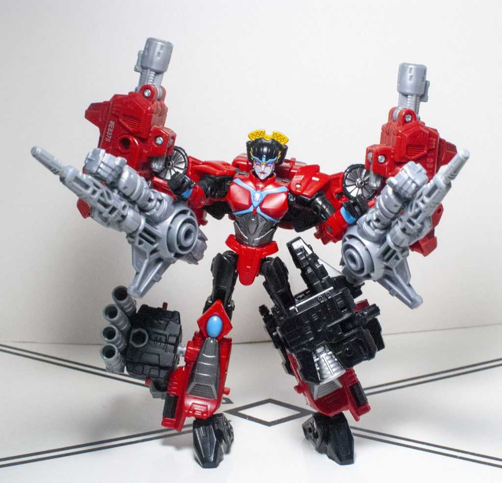 But beyond that original push, the character proved to have legs on her own merits, going onto appear in multiple shows (The Prime Wars trilogy, The 2015 Robots in Disguise cartoon, and Cyberverse), a ton more comics, and get more figures than just that first one. Which is a good thing, because man, that first figure was *not* good, which was disappointing. To put it briefly, it can barely stand under its own weight thanks to bizarrely-designed feet, one of the accessories broke like a minute after unboxing my copy (it’s glued on now), and just, generally, she’s really fiddly, somehow both over and under-designed. Luckily, that wasn’t the only time they tried. Still, up until now, there hasn’t really been a “definitive” good version of her. The Titans Return one, which I reviewed some years back, was pretty fun, but it was kind of an odd variant instead of her standard look, and still had a few frustrating shortcomings, on top of being really rare.