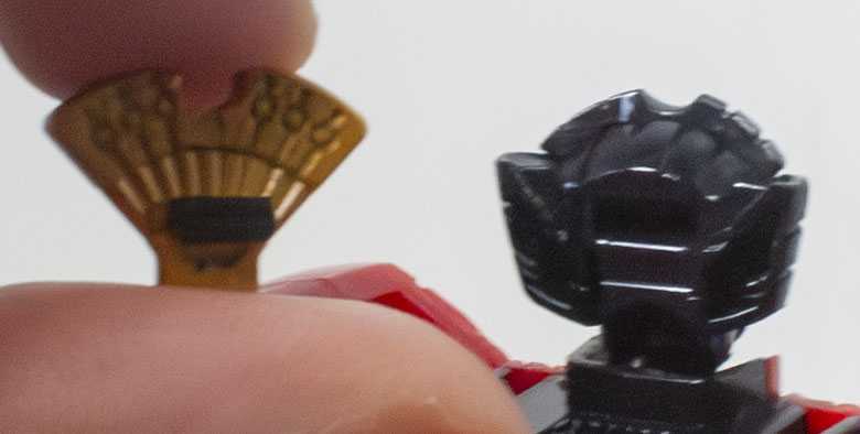 The colors are, again, traditional Windblade: Red and black plastic, with hits of light blue and silver across her body. Probably the biggest shift in her design over the years, I think, is that there’s gradually been more red and less black on her. What hasn’t changed is that her head gets the lion’s share of the deco, thanks to that geisha motif, with a silver face with ornate patterns in blue and red on it (including lipstick), plus a gold hairclip at the back. Again, the idea’s a bit dated, but the execution’s done really well.