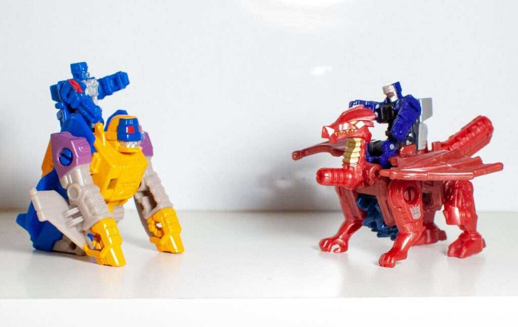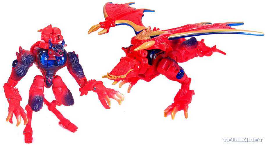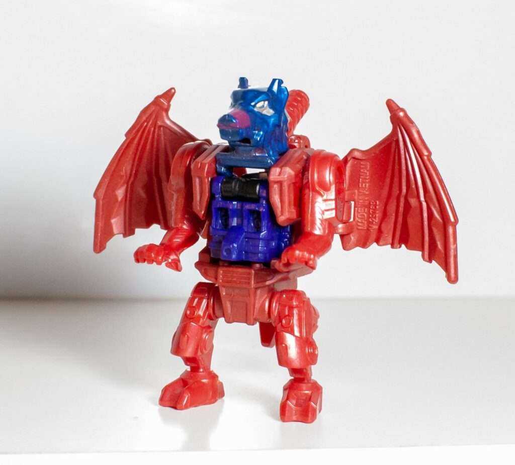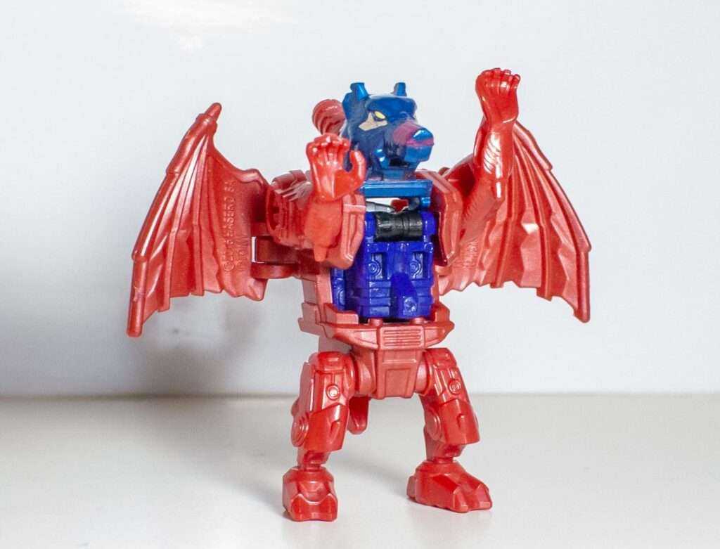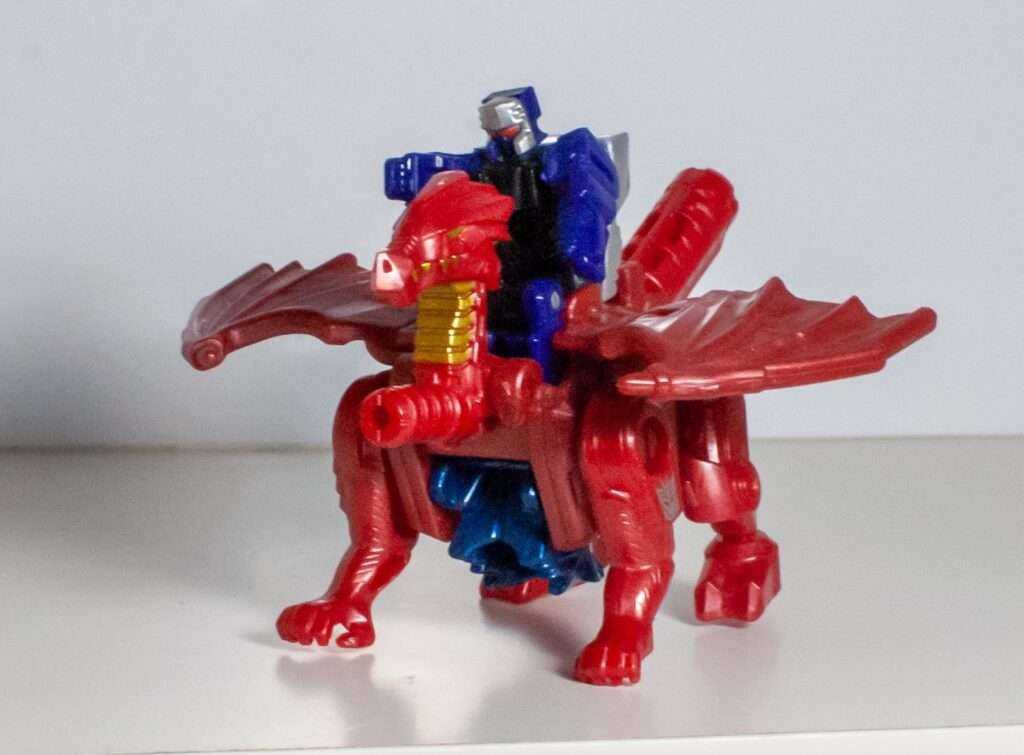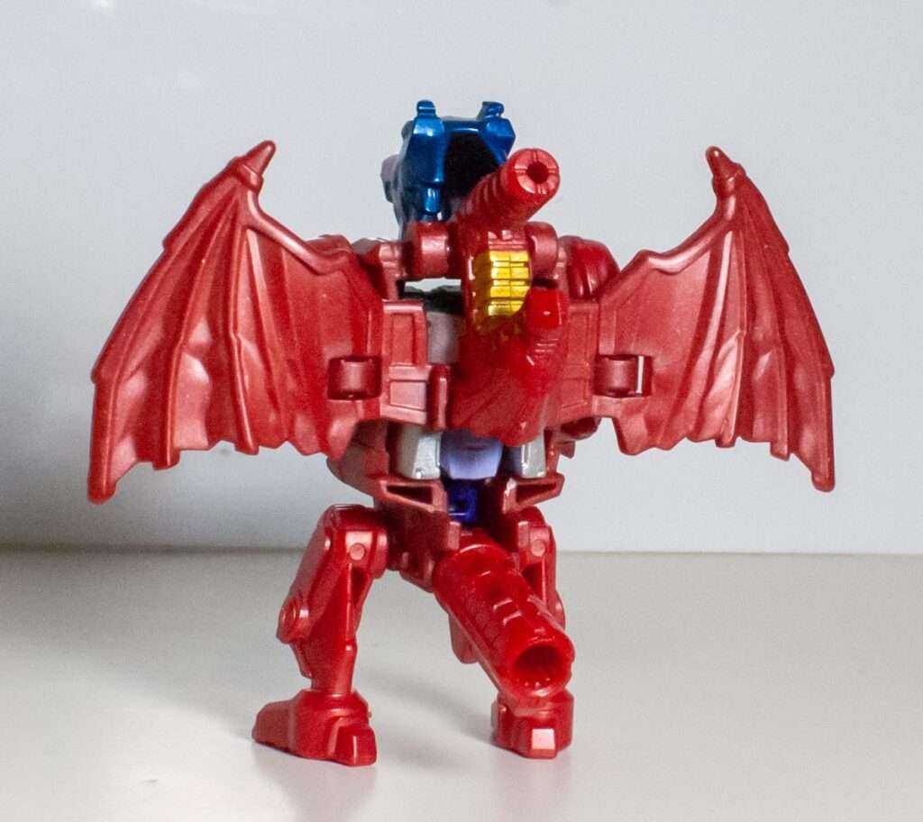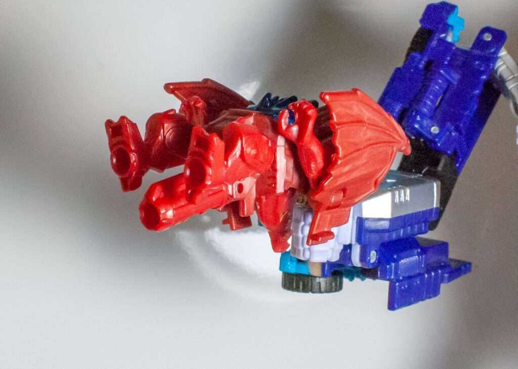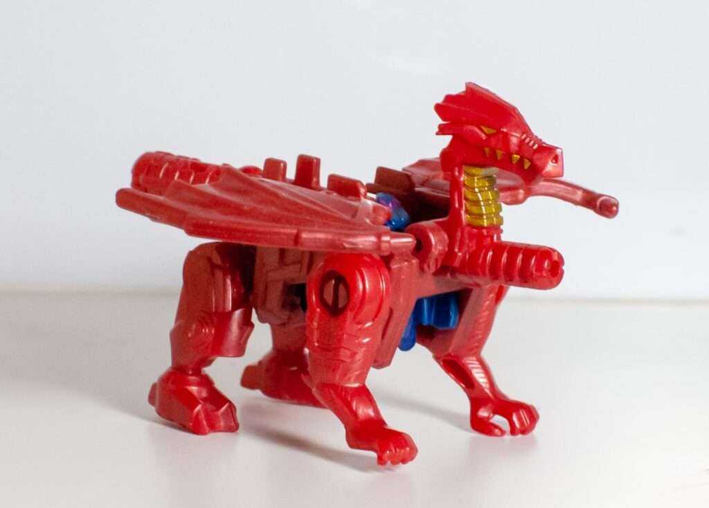 Out of the box, he comes in his dragon mode, which itself hosts another homage (I told you, like a nesting doll). This four-legged dragon in red resembles TM2 Megatron more than Noble’s monster mode, making it a companion piece to Ape-X-Arms from Convobat, styled after Optimal Optimus.