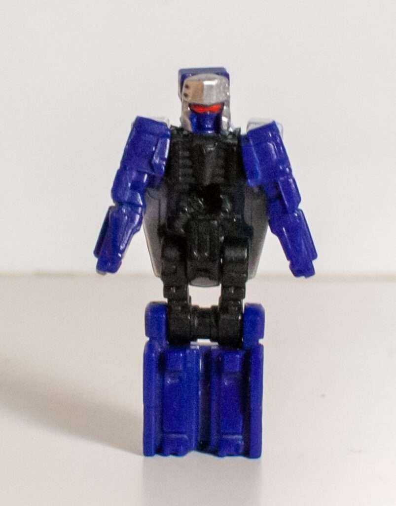 As a feature in his form, Mini-Megs can ride on his back, albeit a bit shakily, and it forces the altmode head out of Noble’s torso a bit. Speaking of the altmode, to transform him, you stand him up, swap his head out, wad up the Titan Master and use him to fill in his torso.