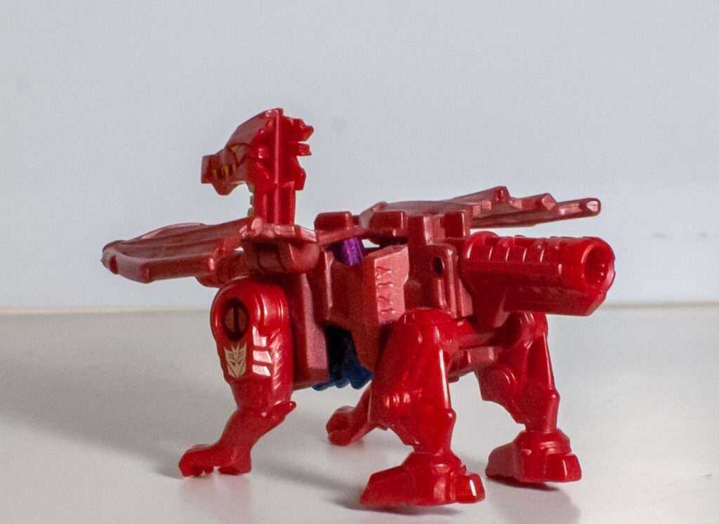 No matter what he’s supposed to be, he looks good in cherry red, with bits of gold paintwork, and a silver Decepticon logo on his foreleg. He’s kind of adorable, though the sculpt’s a bit broken up by the big handle sticking out of his neck, and his hollow body where his altmode head hides.