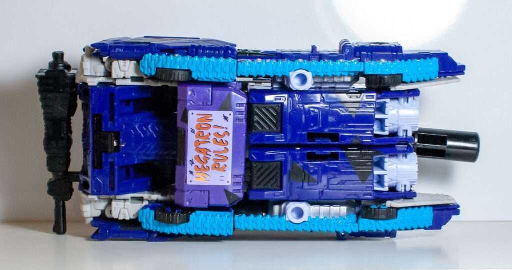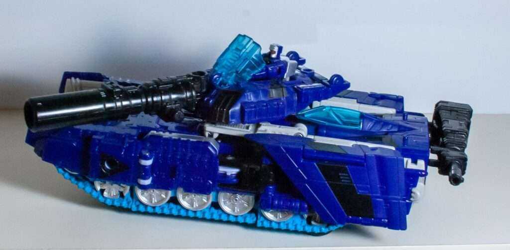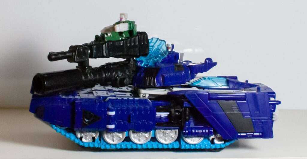 For features, the tank rolls on four tiny wheels beneath the sculpted-in treads, and the turret rotates, but does not raise. You can lift the clear blue plastic bit on the turret, and sit a Titan Master beneath it, with the blue acting as a windscreen.
