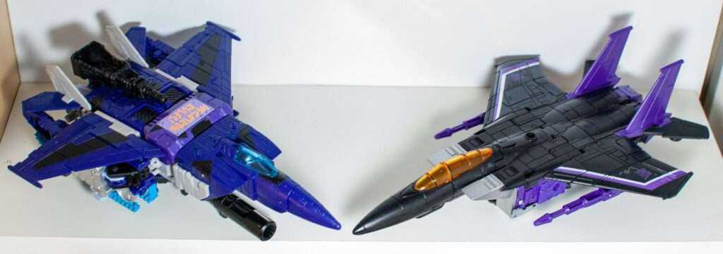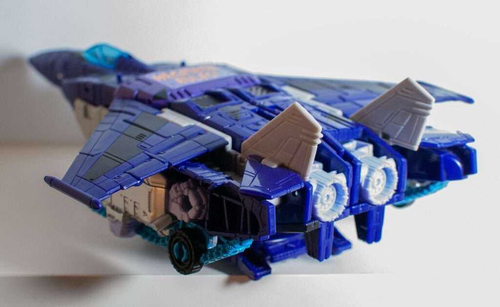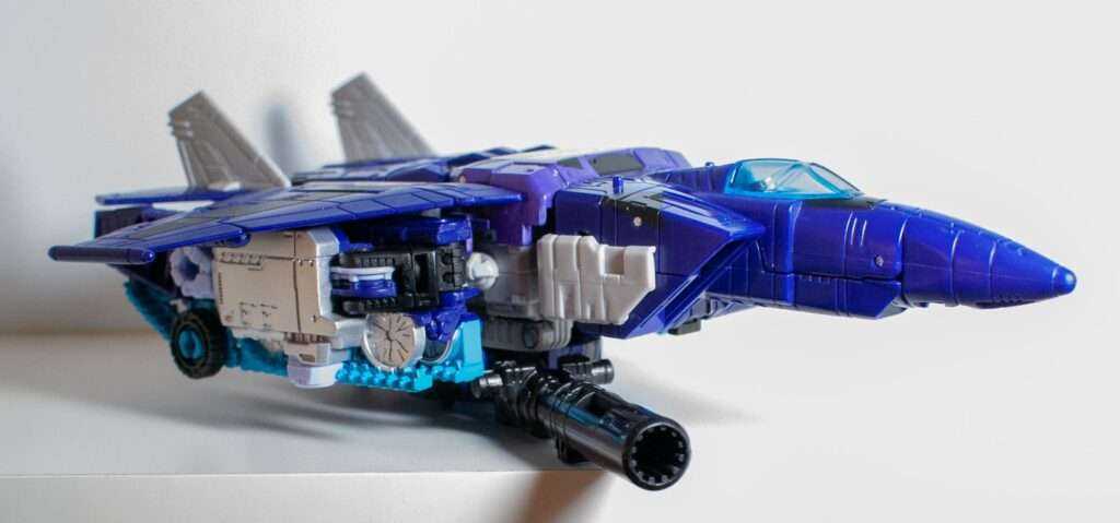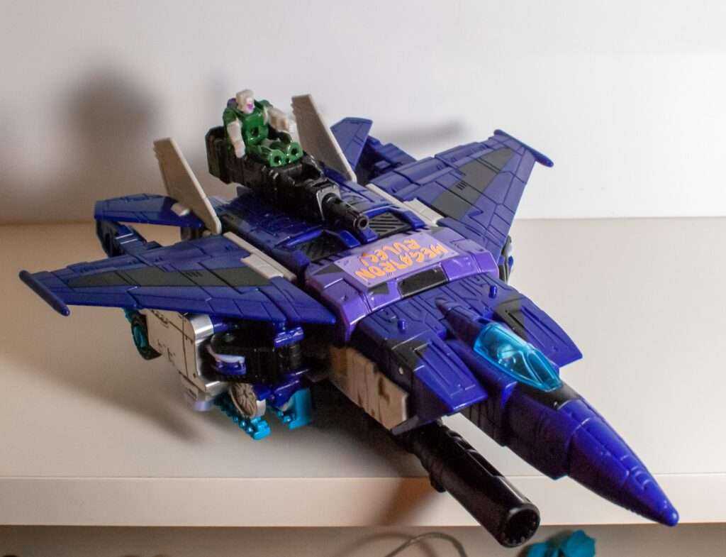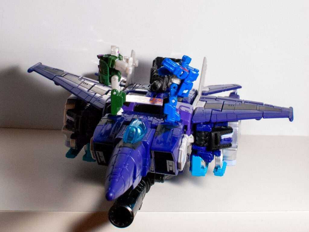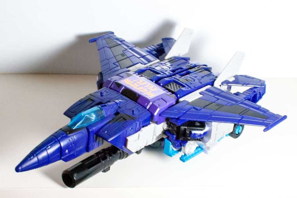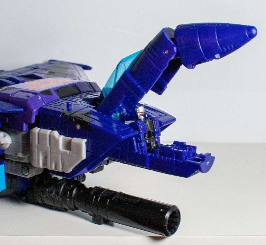 Again, the colors are doing a lot of heavy lifting here, and his purple, black, and grey look really nice, along with the clear blue cockpit, giving me a vibe somewhere between “G1 Skywarp” and “G2 Ramjet.”
