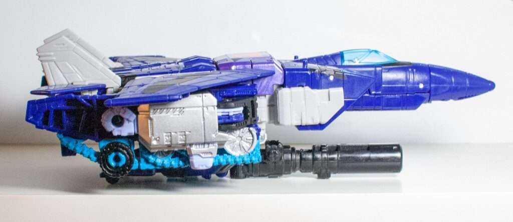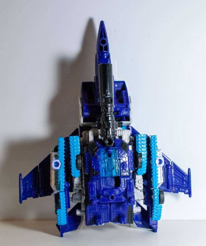 A.k.a the mode that’s only here because of Blitzwing. Most of this mode is a pretty standard Seeker-esque fighter jet, with a familiar-looking cockpit, wings and tailfins. It’s trying really hard to look sleek and aerodynamic, but it’s burdened by having to carry folded-up tank treads (with visible fists) beneath each wing, and an entire tank turret for undercarriage.