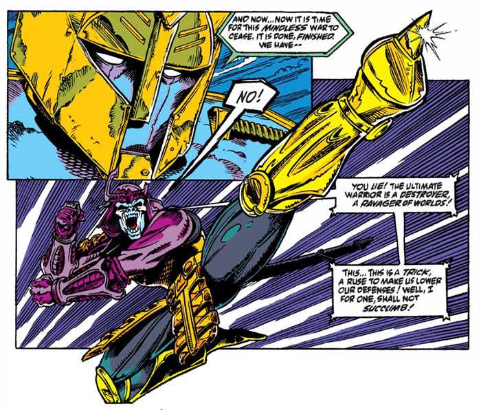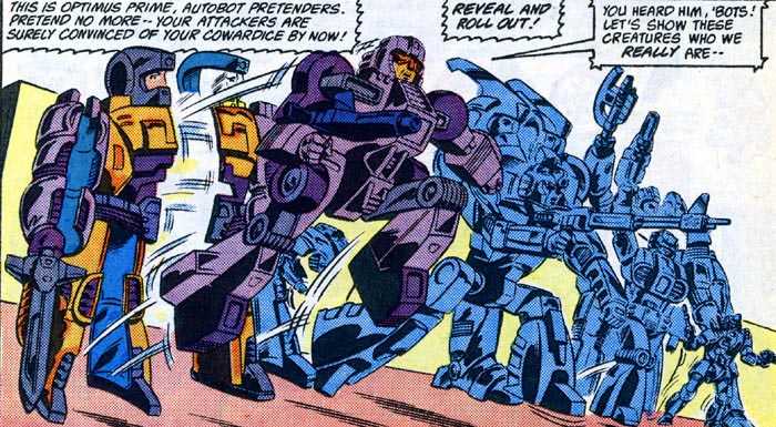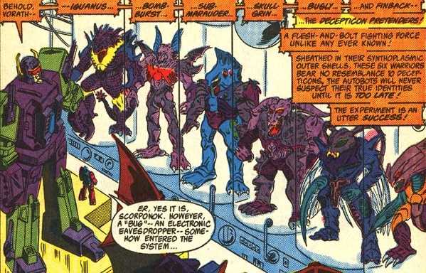 The fiction tried to play the disguise angle straight, made worse by the fact that the pretenders were still depicted as gigantic while inside their shells. Before long, though, the comic gave up trying to make them make sense as disguises, and treated the shells more as battle armor (Over in Japan, the Masterforce anime had them shrink down to human size and lose the armor to disguise themselves, summoning it back as a Tokusatsu-style transformation, while treating the more beastly designs like the animation equivalent of that same genre’s rubber suit monsters.)