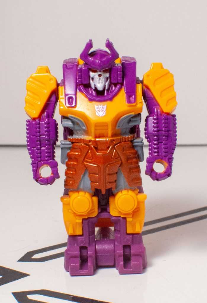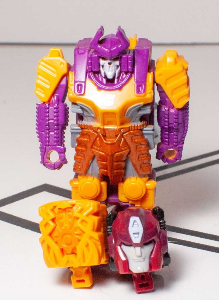 Bludgeon’s got a ton of paint apps, surprisingly, though they’re all at the front of the shell. The back half is cast in purple, and the front half is cast in orangey-yellow, but it’s positively slathered in purple, gold, gray, white (for the skull), and a silver Decepticon symbol. It all looks really nice, even if it does cut off the second you venture around the back.