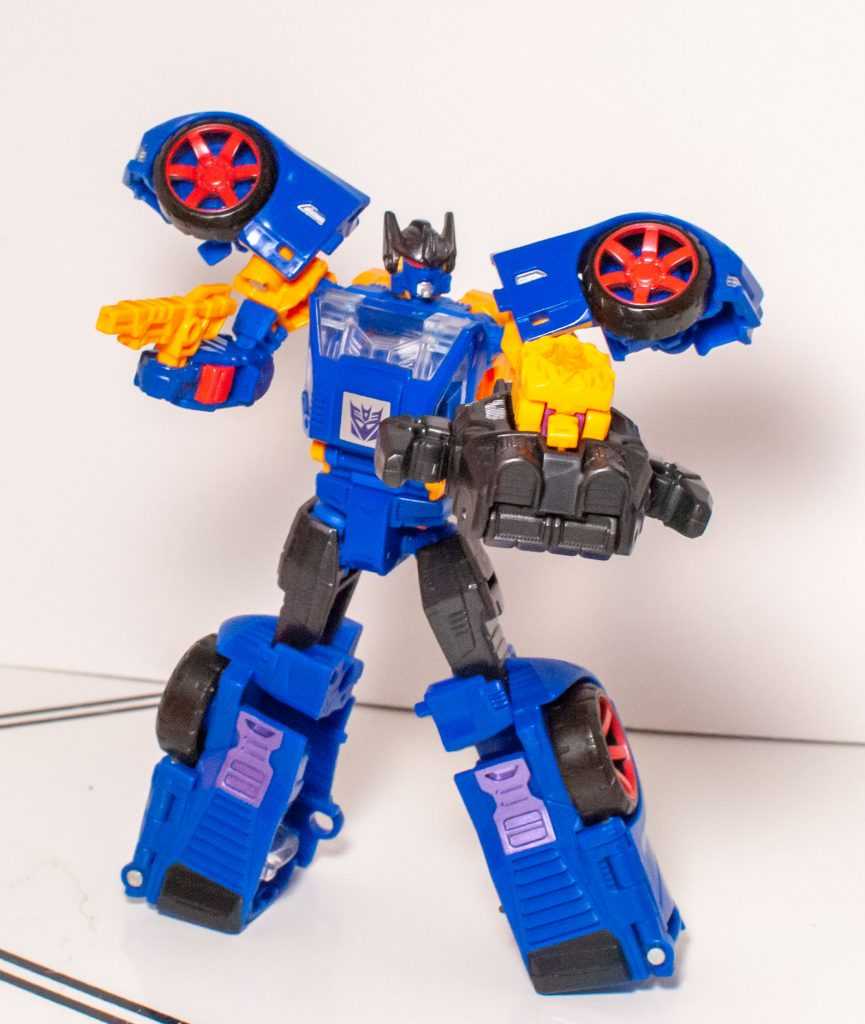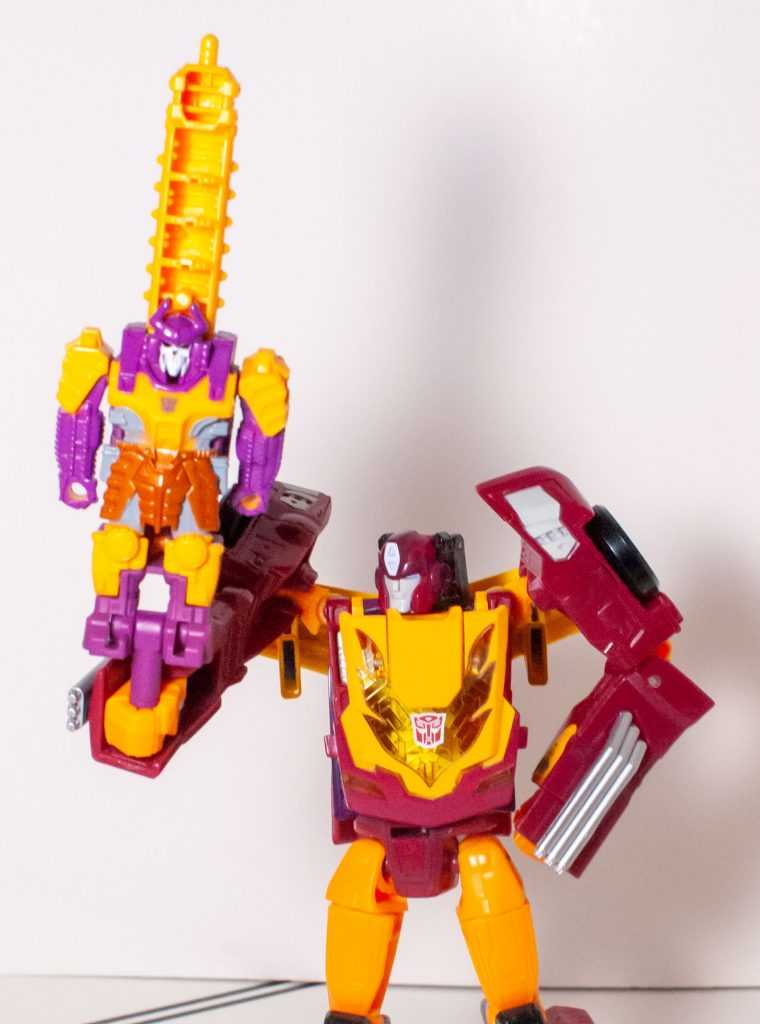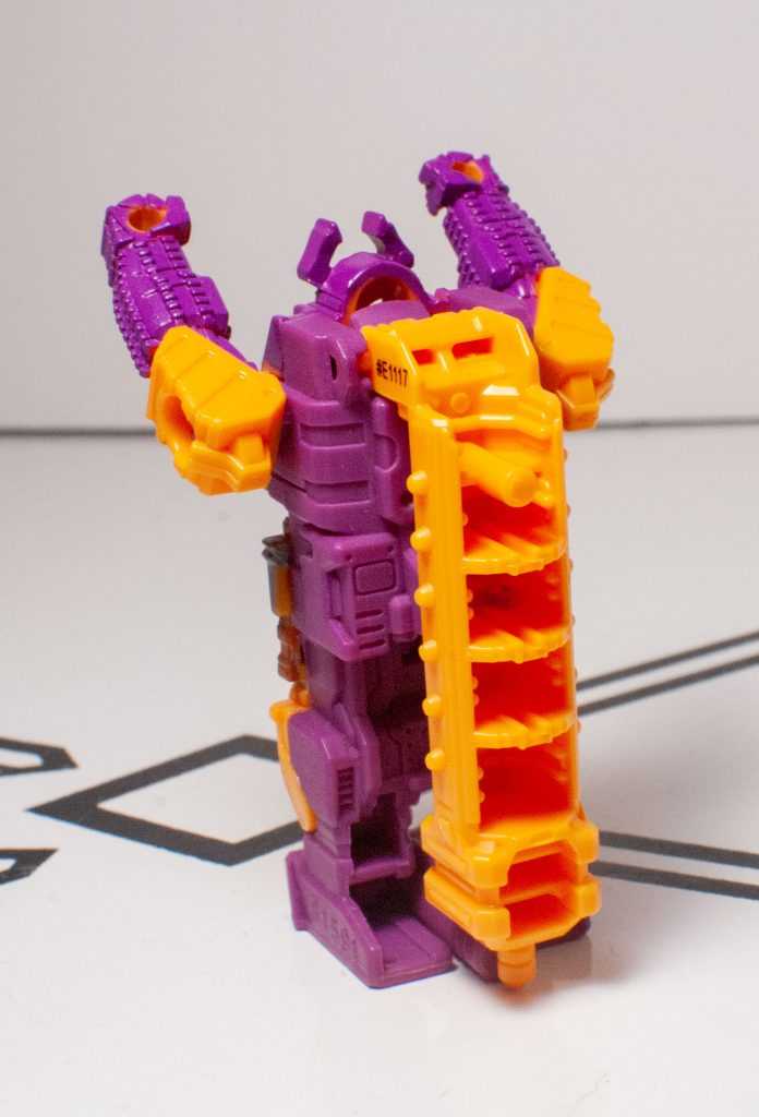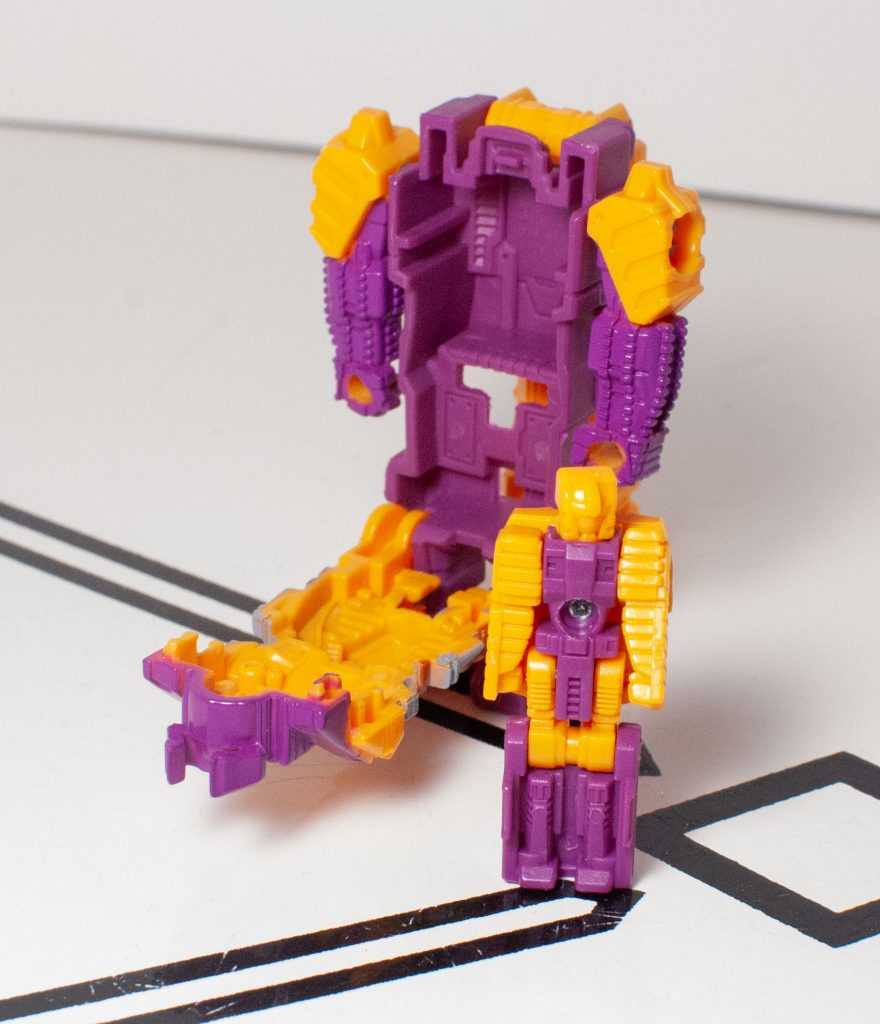 Still, they managed to give him molded tank treads on his arms, a visor over his eyes, and other Bludgeon-specific details. Unfortunately, he’s cast in purple and orangey-yellow, without a trace of the original’s green, or any paint apps, really, a common problem with figures in both this line and Titans Return.