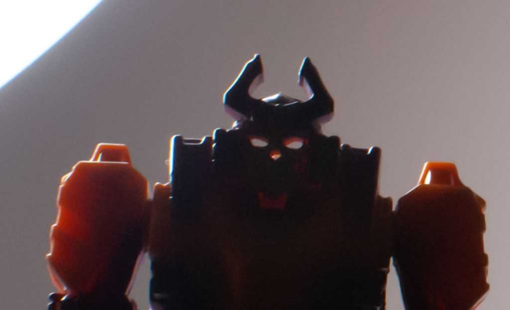 Bludgeon being essentially a brick means that he’s really stable on his feet, but also means that he has very little in the way of articulation. He can only move at the shoulders, swiveling his arms forwards and backwards, which, funny enough, is exactly how articulated his G1 shell was. Though, really, I don’t see how they could have made him poseable at this scale while still replicating his classic gimmick.