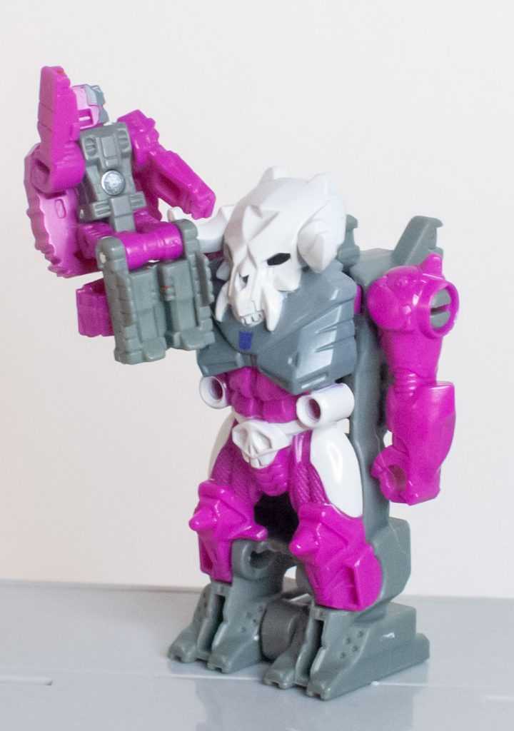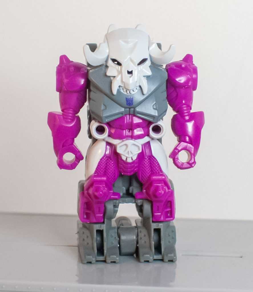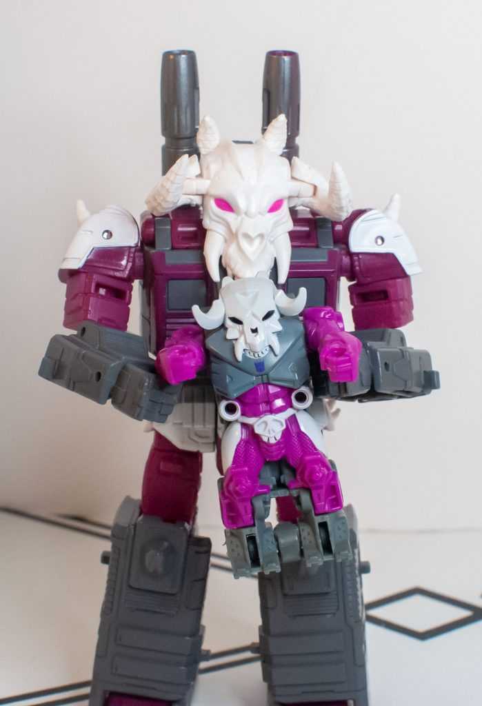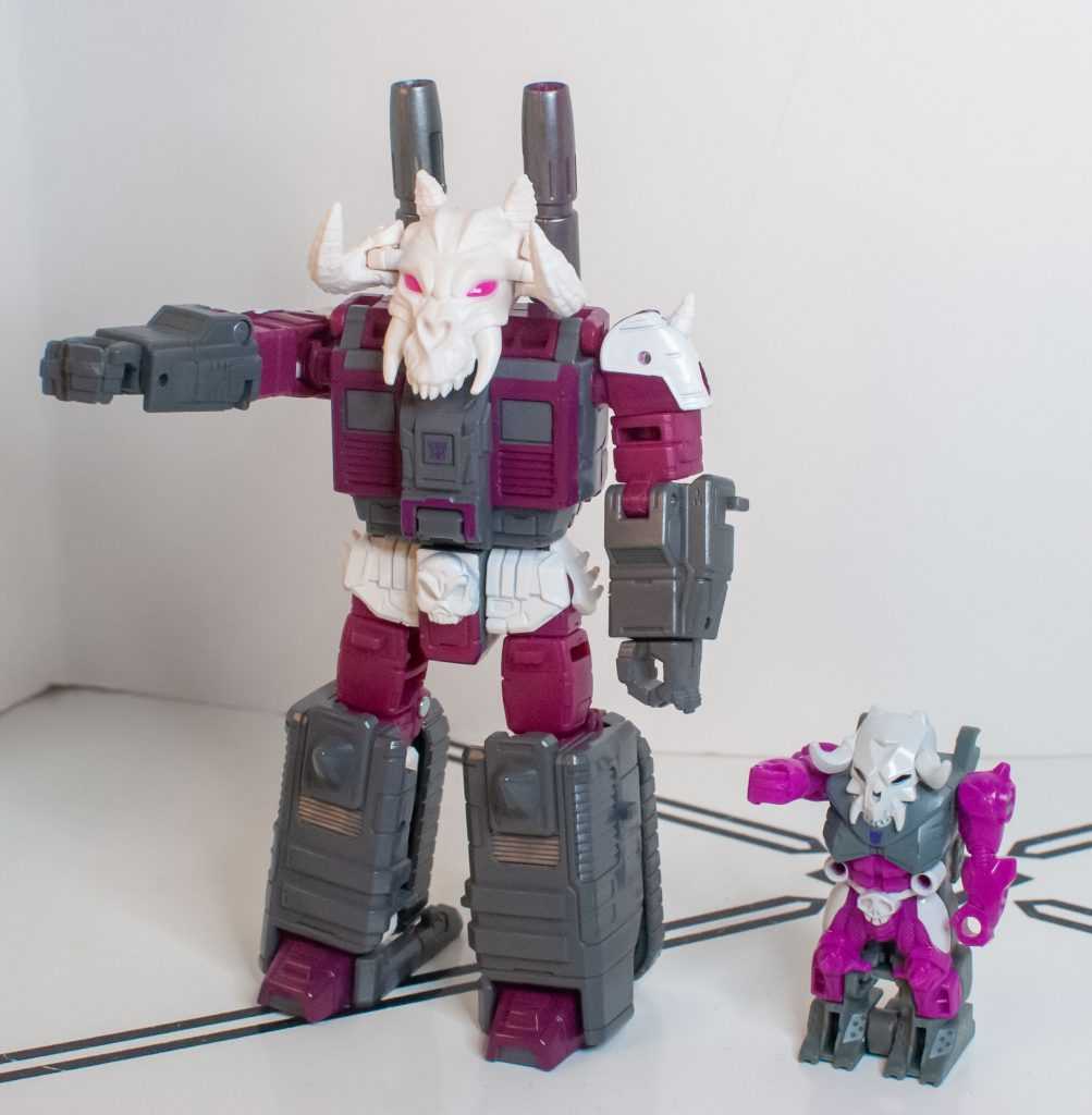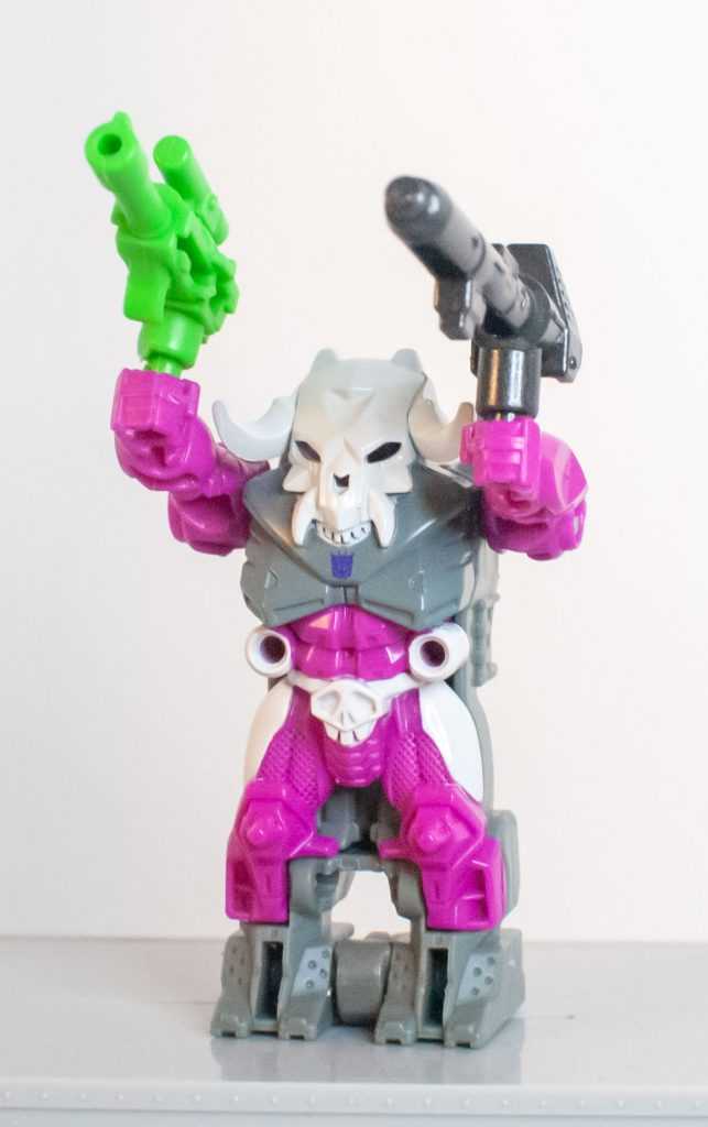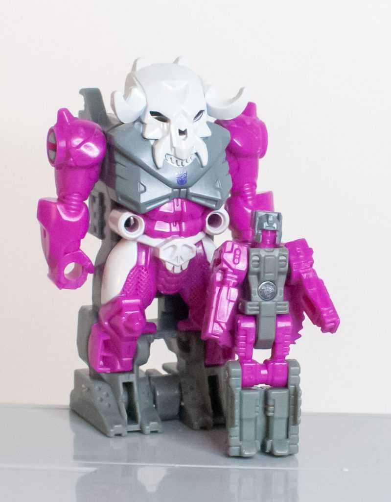 For deco, he’s mostly purple and gray. It’s a lighter, more vibrant purple than the Legacy figure, and makes for a very classic “late G1 Decepticon” set of colors. He’s also got a bone-white skull and belt, and a millimeter-tall Decepticon logo on his chest. It’s fairly simple, and nowhere near as ornate as Bludgeon’s deco, but it works well for him.
