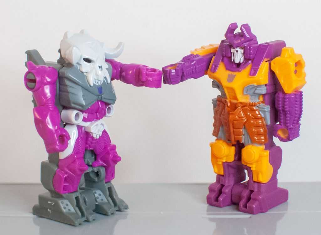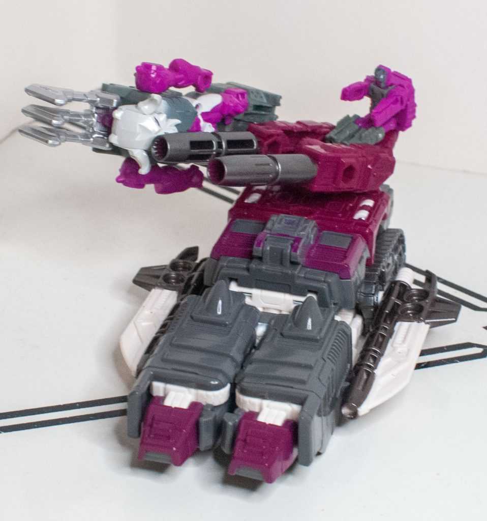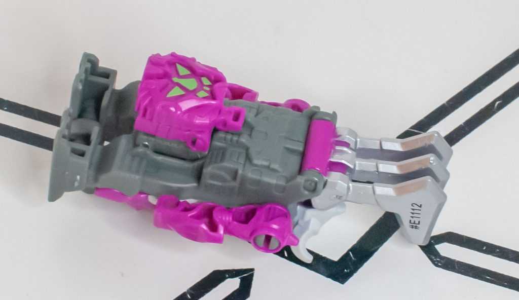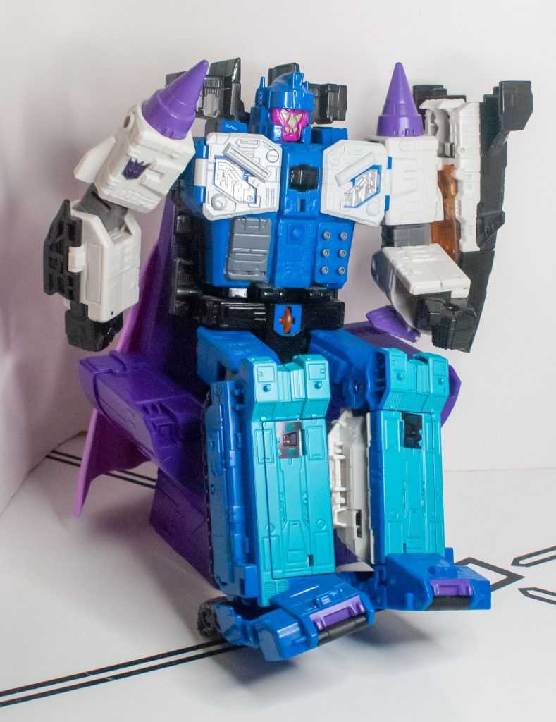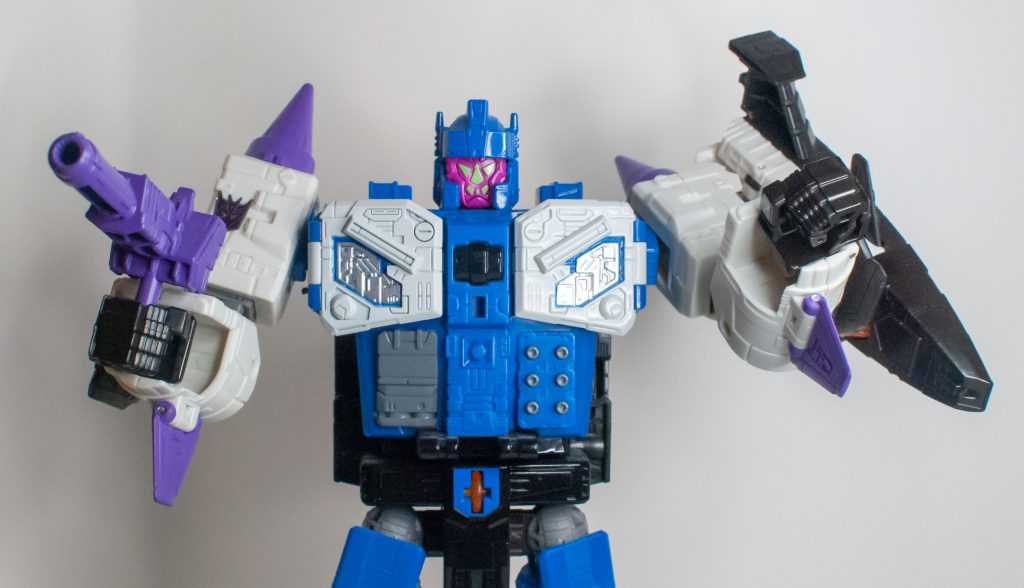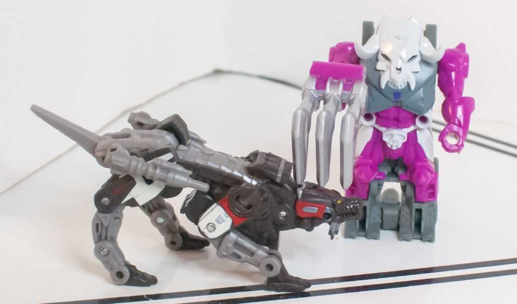 For deco, he’s mostly purple and gray. It’s a lighter, more vibrant purple than the Legacy figure, and makes for a very classic “late G1 Decepticon” set of colors. He’s also got a bone-white skull and belt, and a millimeter-tall Decepticon logo on his chest. It’s fairly simple, and nowhere near as ornate as Bludgeon’s deco, but it works well for him.