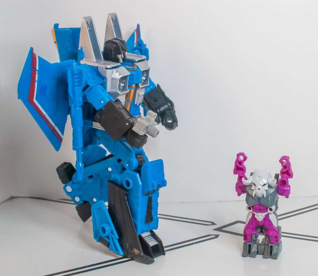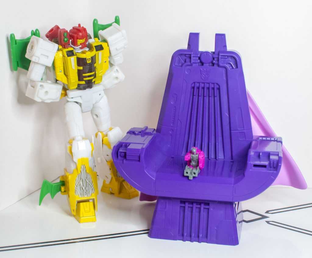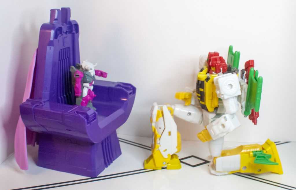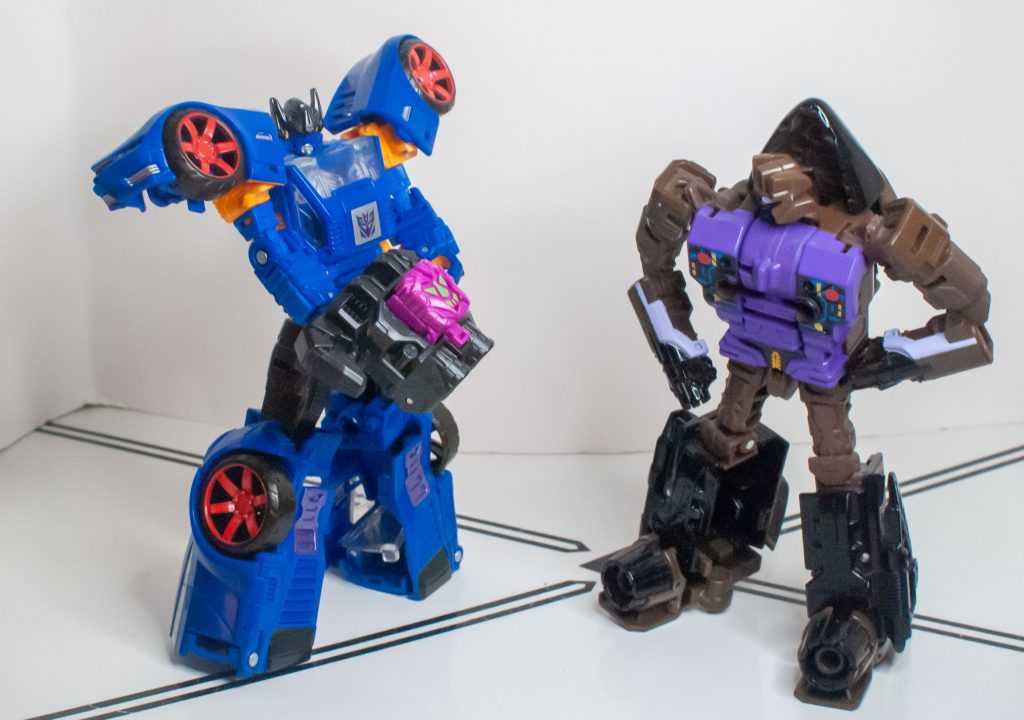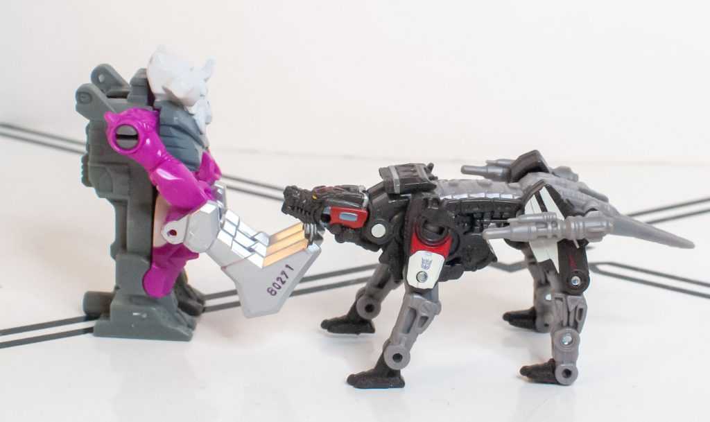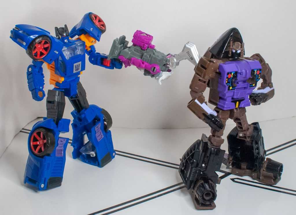 For deco, he’s mostly purple and gray. It’s a lighter, more vibrant purple than the Legacy figure, and makes for a very classic “late G1 Decepticon” set of colors. He’s also got a bone-white skull and belt, and a millimeter-tall Decepticon logo on his chest. It’s fairly simple, and nowhere near as ornate as Bludgeon’s deco, but it works well for him.
