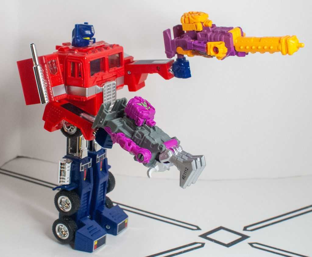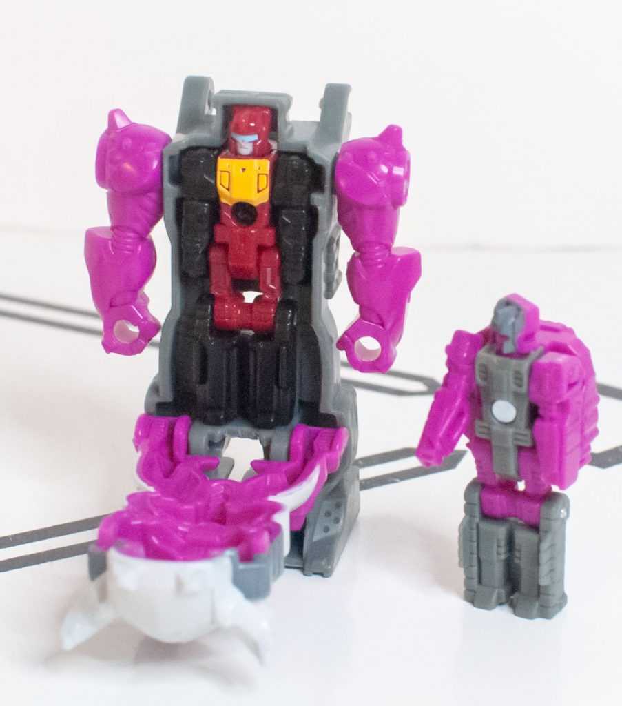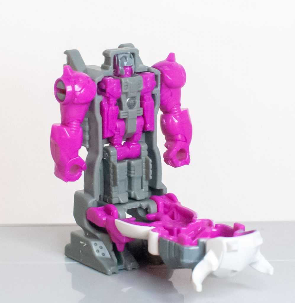 To reach this mode, you just flip up the back-mounted claw on the pretender shell, flip down a tab between its feet, and attach the Prime Spark to his back, using a pair of small pegs that stick to the inner robot’s feet.