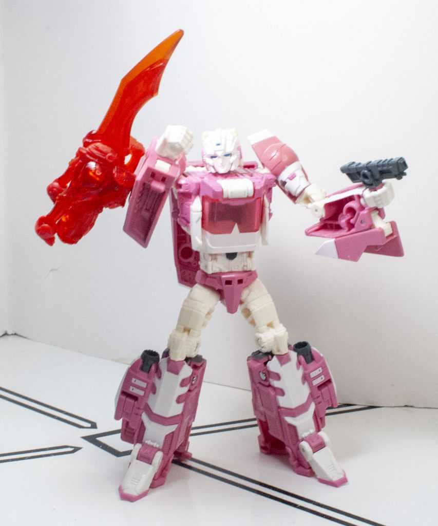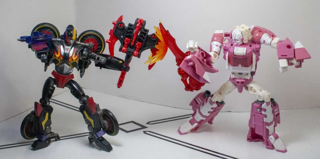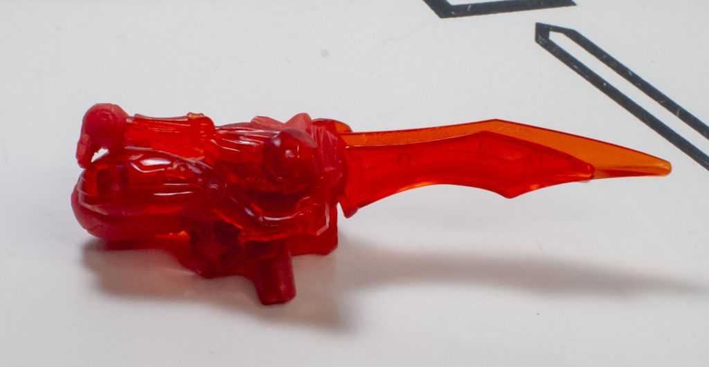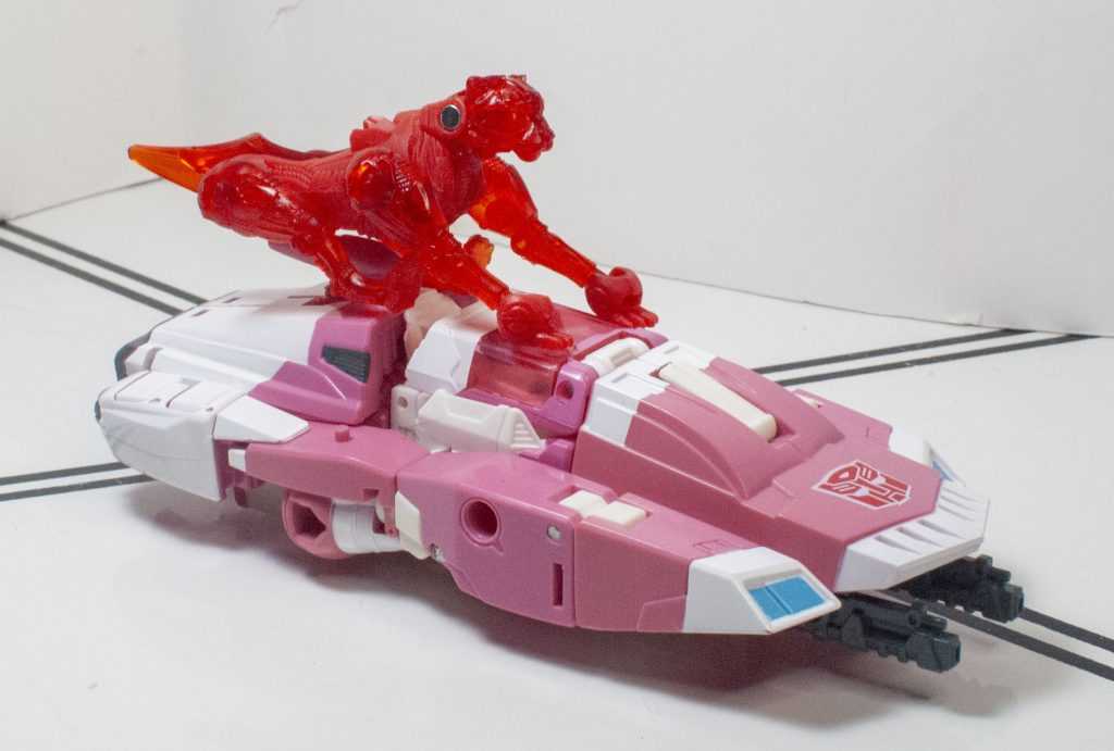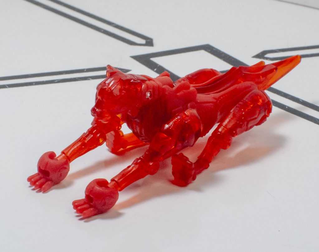 What really works, though, is those colors. Having him be solid red helps hide that it’s a folded-up animal, and the fact that the clear limbs wrap around most of the opaque plastic means that my eyes now read him as being totally transparent, which means that I also read him as a glowing red energy sword, which is just cool, and means I’m inclined to pair him with Titans Return Arcee, since she’s based on the IDW Comics version of her, who favored energy swords.