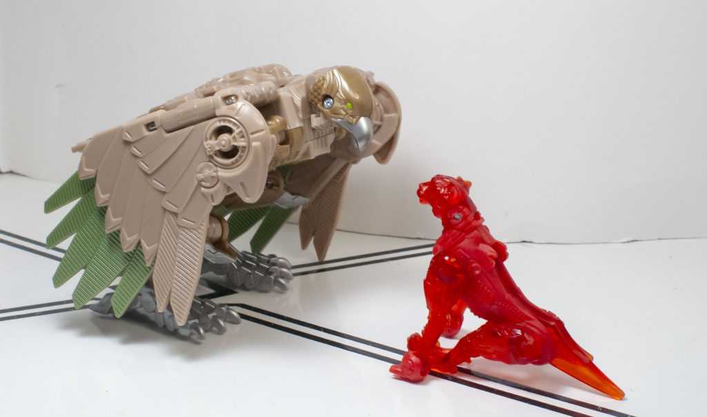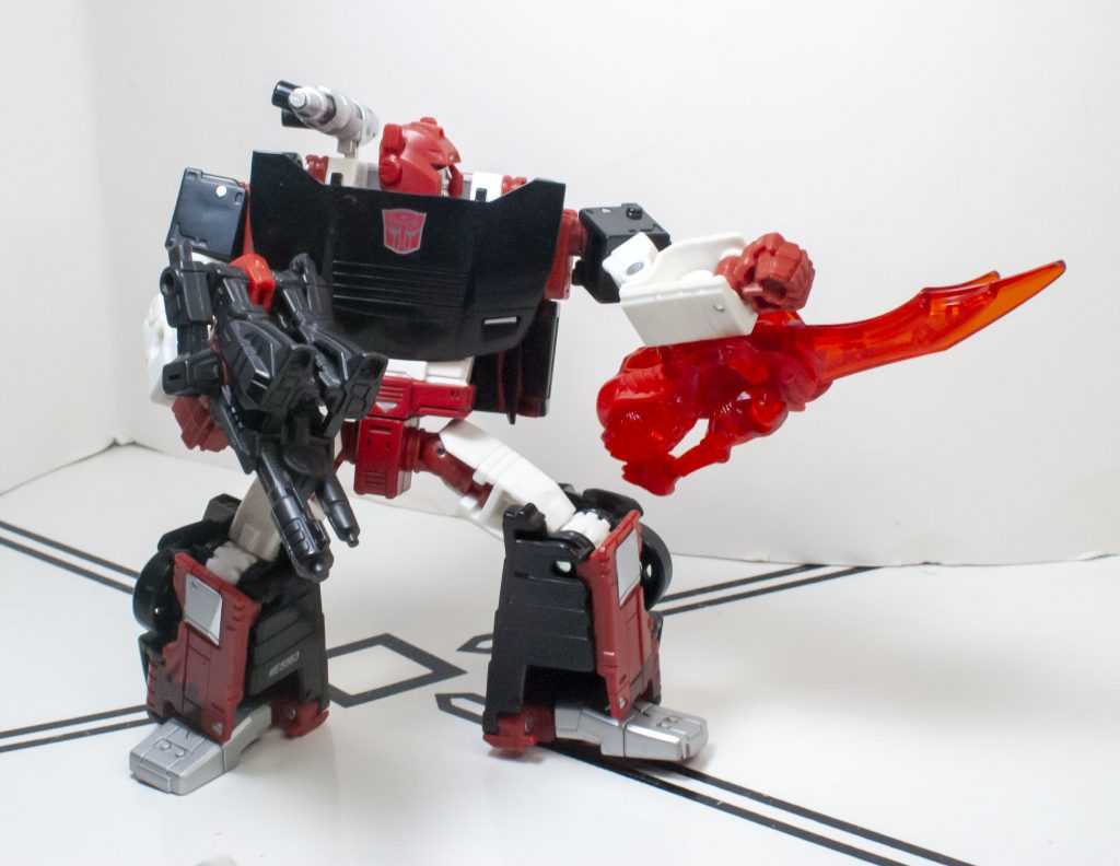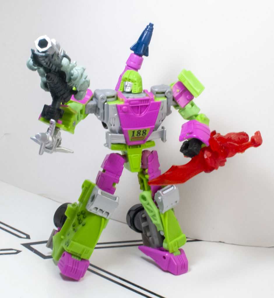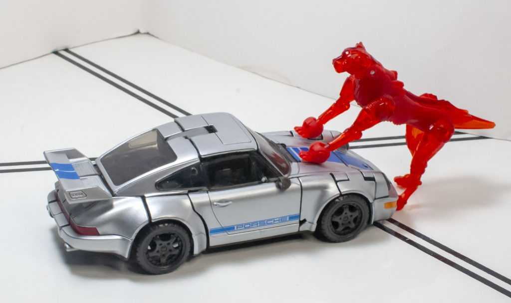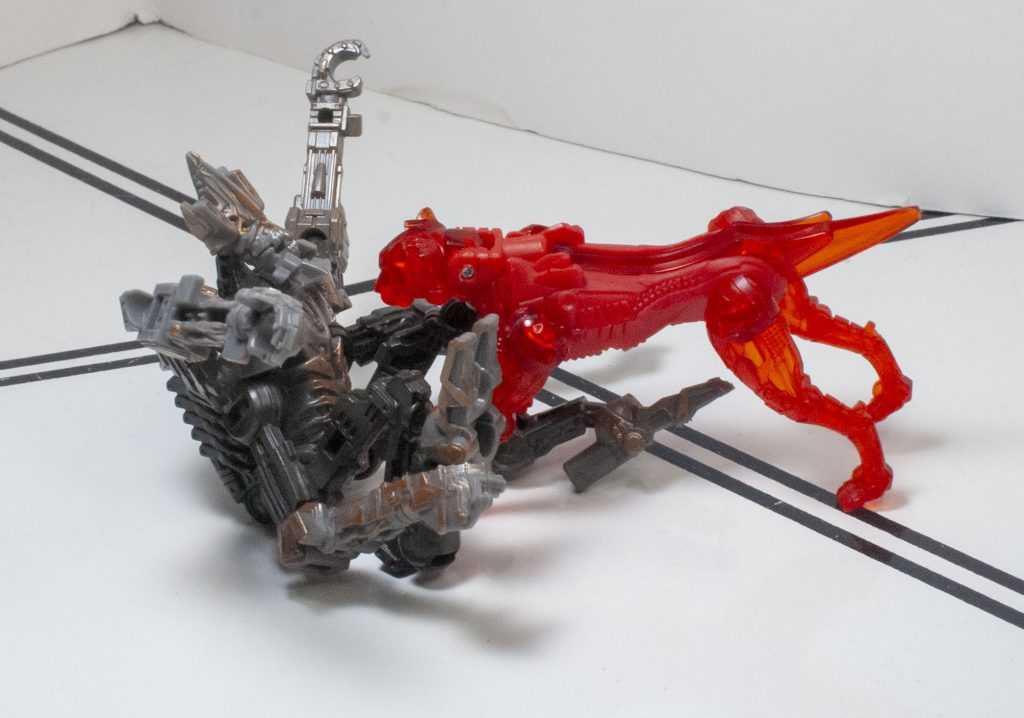 What really works, though, is those colors. Having him be solid red helps hide that it’s a folded-up animal, and the fact that the clear limbs wrap around most of the opaque plastic means that my eyes now read him as being totally transparent, which means that I also read him as a glowing red energy sword, which is just cool, and means I’m inclined to pair him with Titans Return Arcee, since she’s based on the IDW Comics version of her, who favored energy swords.