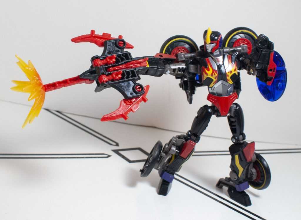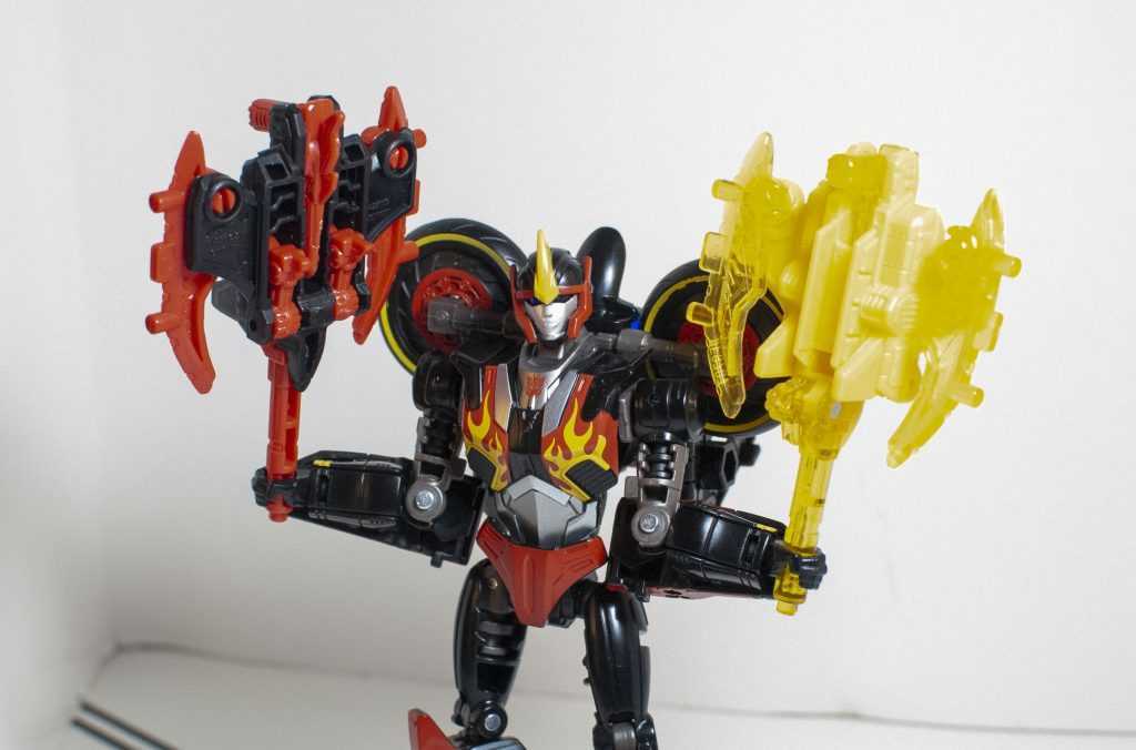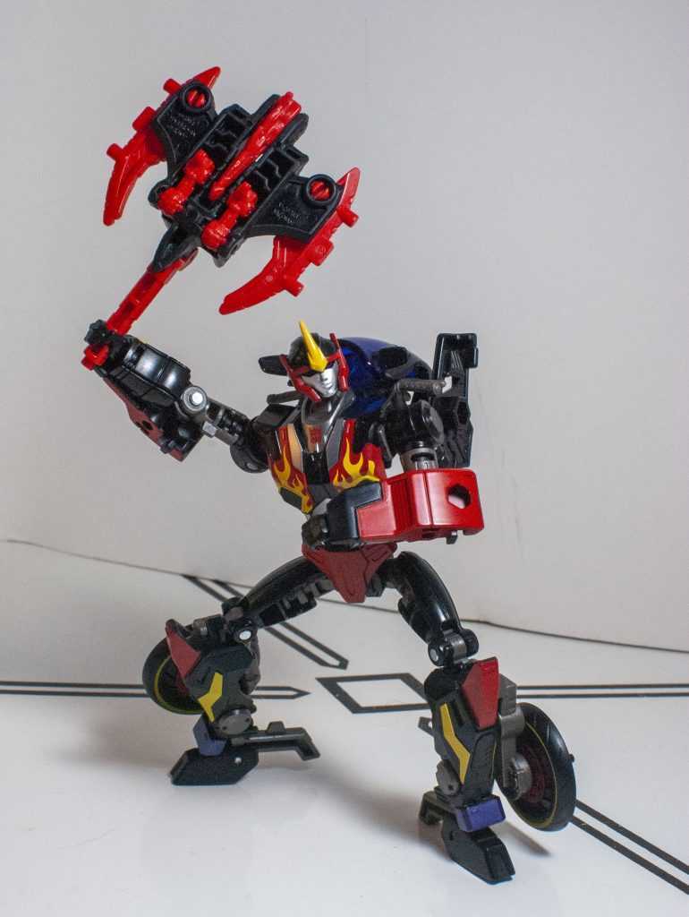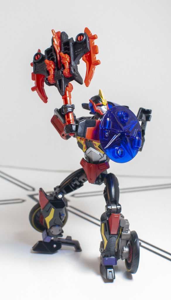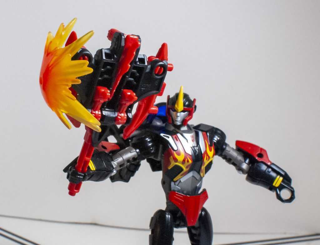 Fold in the legs and head, fold out a handle, and they’re in their weapon mode, an axe for Flamewar.