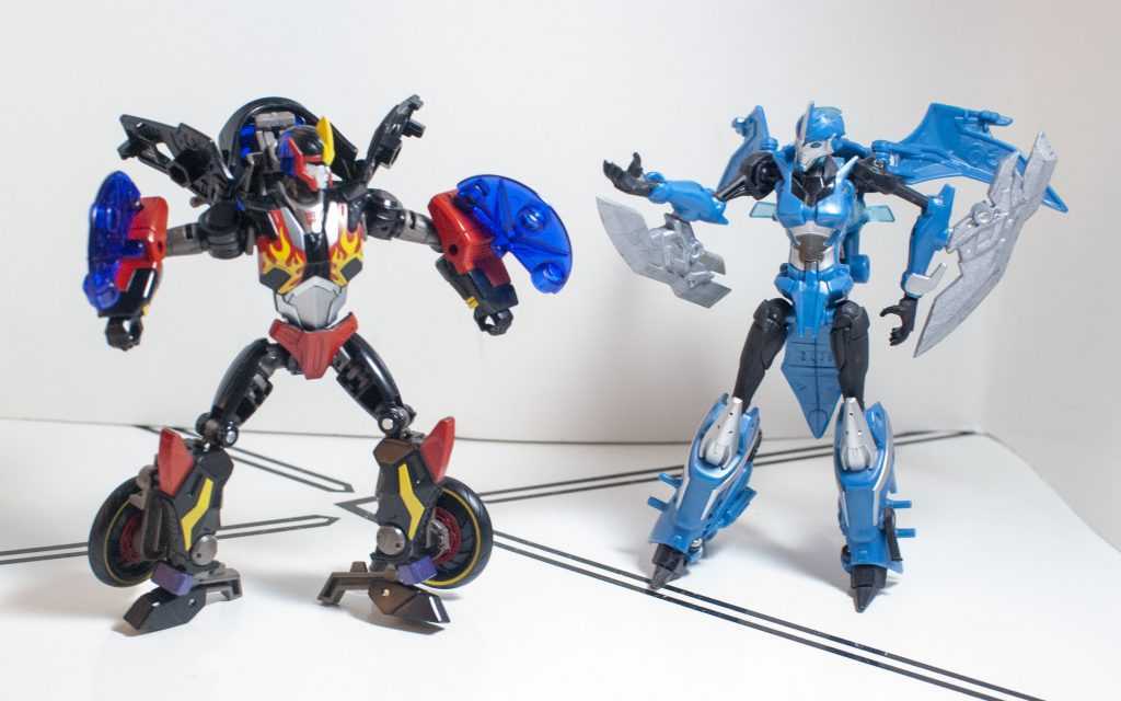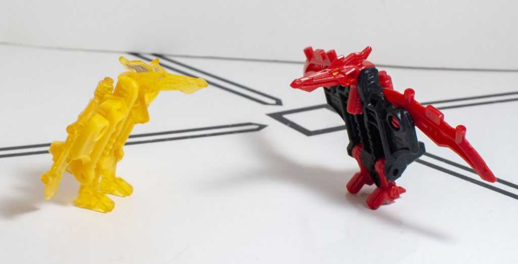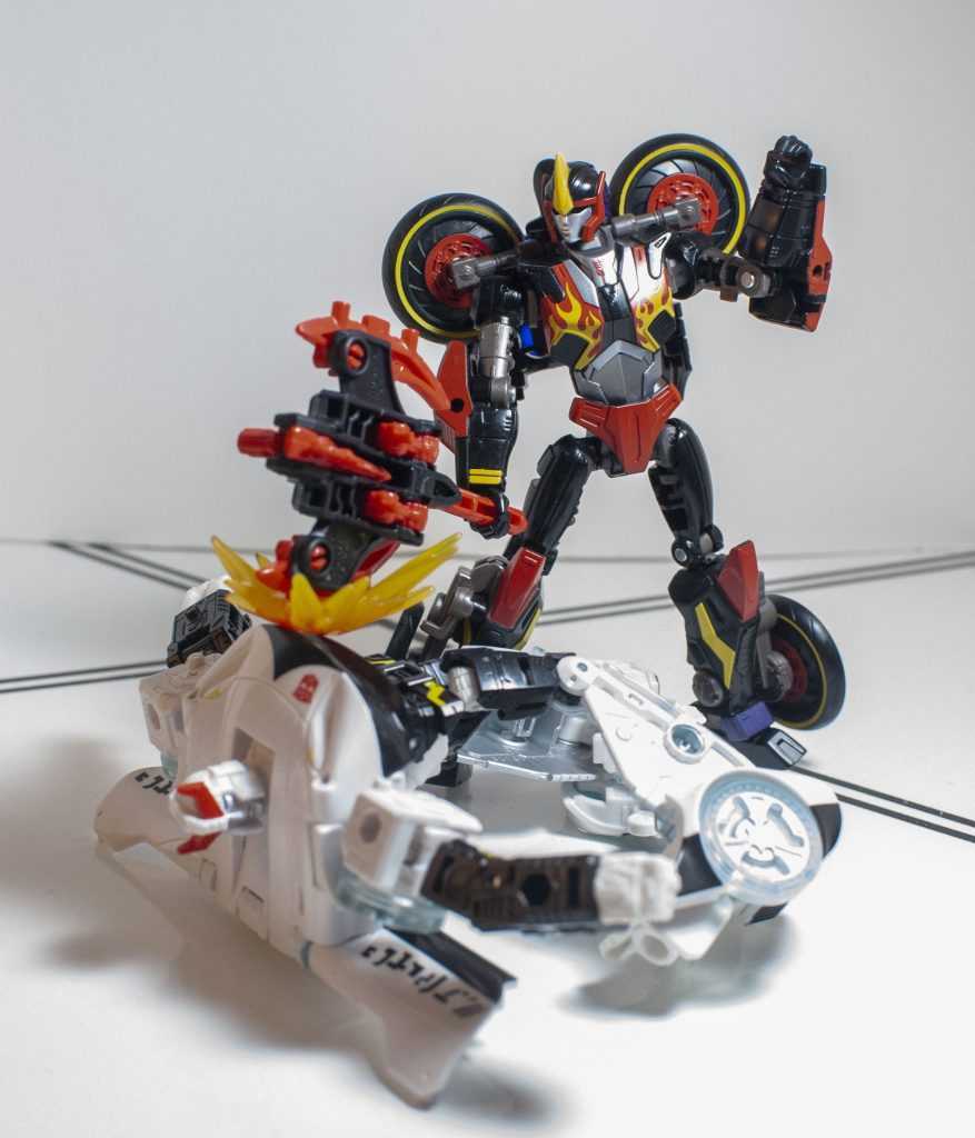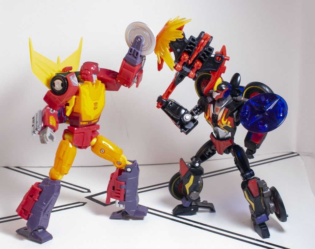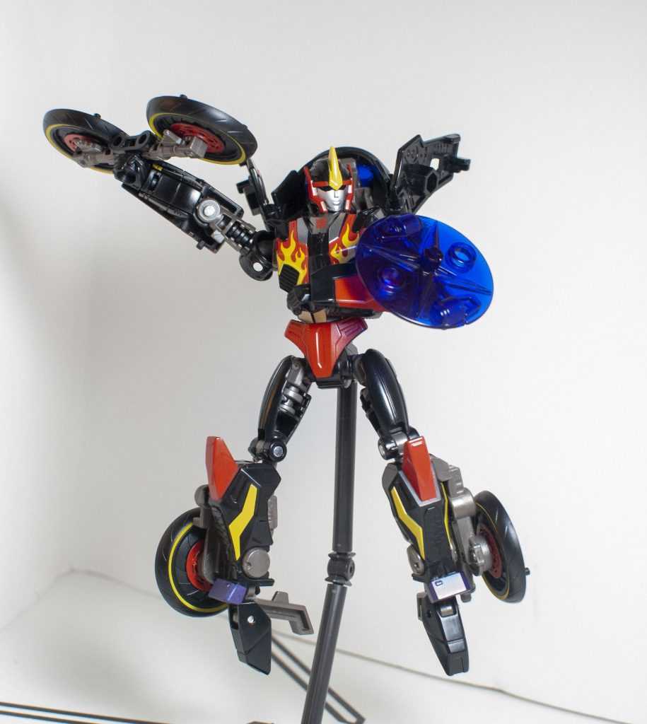 Fold in the legs and head, fold out a handle, and they’re in their weapon mode, an axe for Flamewar.