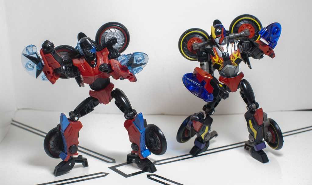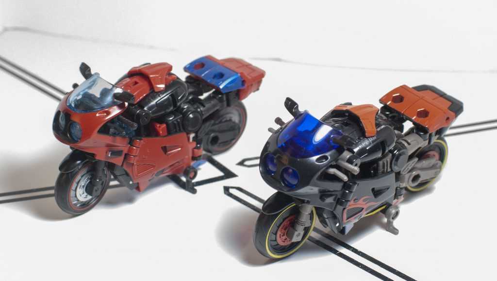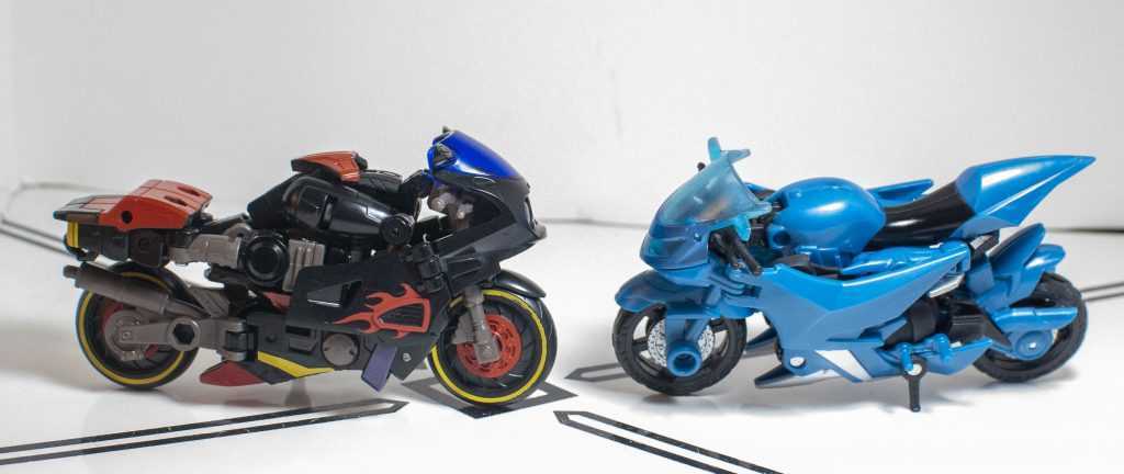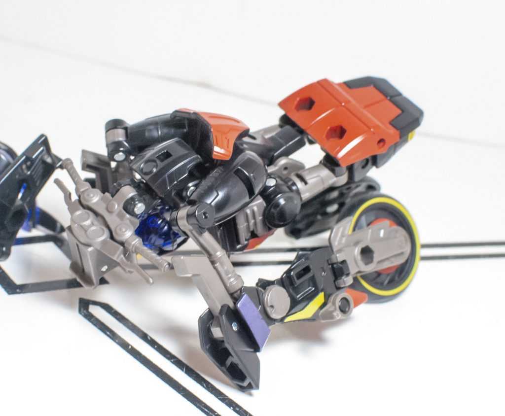 In terms of colors, it’s kind of funny how similar this is to Road Rocket now, in a way the robot form wasn’t. They’re both red, black and silver bikes, Flamewar just has a bit less red, a lot more black, and a bit more silver (plus, her windscreen and headlights are purple now). But she makes up for it with more of that fancy, premium deco, including both yellow and red on the wheels, and small flame patterns along her sides. The only downside to this deco, to me, is the specific red and black color blocking really highlights how her….pelvic plate?….is just out there on top of the bike.
