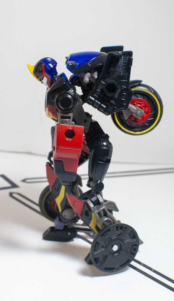 Go ahead and just pop the backpack off, it’s going to come off anyway, same with her front wheel. At least they’re both easy to pop back on. This is still a transformation I find deceptively complex, pretty much entirely due to a) always forgetting I need to twist her waist around, and b) figuring out exactly how her legs and lower torso explode, and reform around the rest of her to make their chunk of the bike’s body. I’m not ashamed to admit I still glance at the instructions, if only to verify I got it all correct.