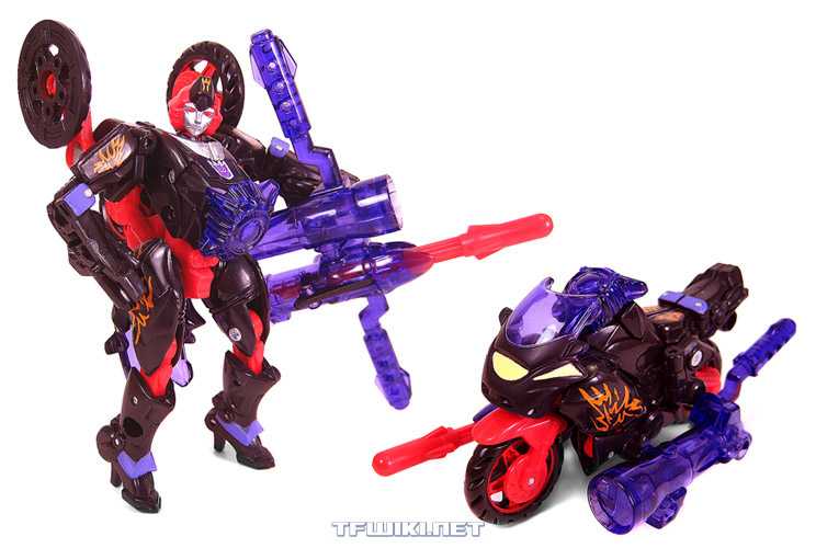 But let’s back up. Flamewar was a Botcon-original character, a repaint of the Transformers: Energon version of Arcee, available at their 2005 convention, portrayed in the convention-exclusive story materials as a hardline Decepticon loyalist, keeping the flame alive in a time period when the war had ended. She didn’t make much of a splash, but as a potential repaint of a motorcycle-former version of Arcee, this led her to get a random Transformers: Prime minifigure in 2011….