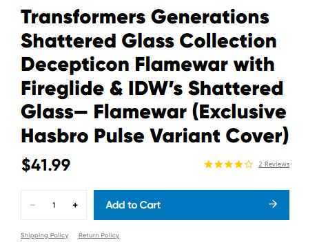 Most of this doesn’t matter, it’s just Flamewar in an odd box, until the price tag comes into play. See, Shattered Glass is an *expensive* Transformers line, between the figures having higher-budget-than-standard paint jobs, and shipping with comic books, and it’s worse for a Canadian like me, thanks to shipping and exchange rate that comes with buying them off Hasbro Pulse, an American site. Canadian Gamestops did carry Shattered Glass Megatron and Starscream (without the comics), and then seemingly gave up on the line, so I’m priced right out of it. But, I decided to pony up the dough for Flamewar, out of love for the character, and the Ruckley-formers comic, so the onus is on her to be worth the hefty price tag, especially considering she’s a repaint of a tooling I already have (and reviewed) as Legacy Road Rocket (see here for my thoughts on her).