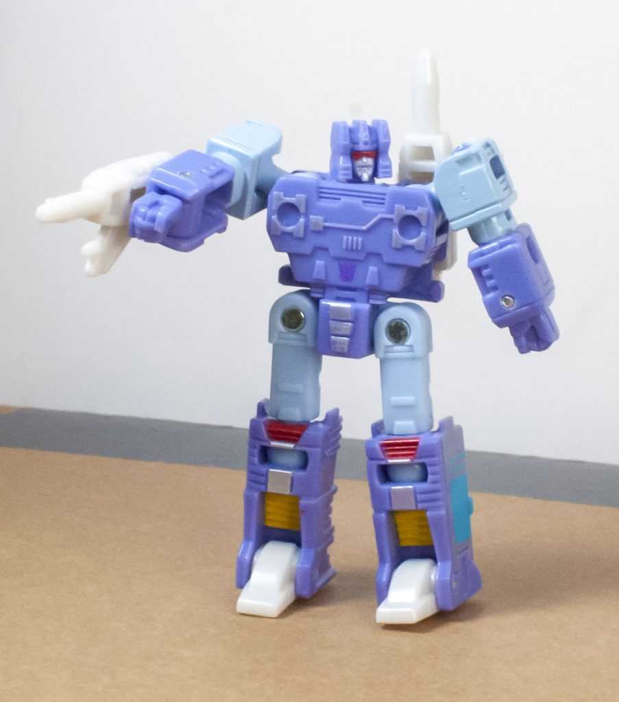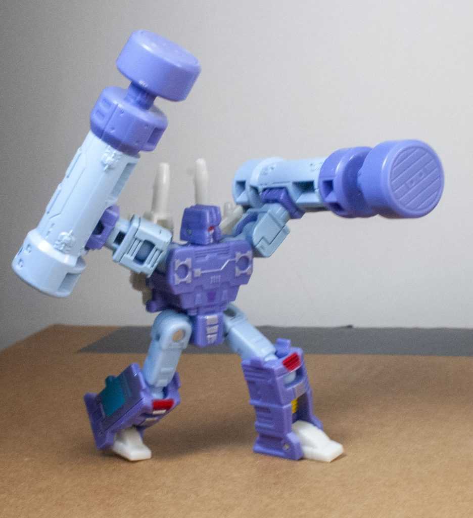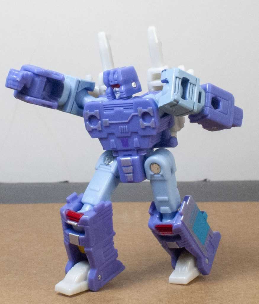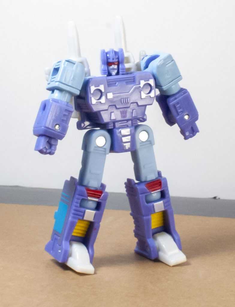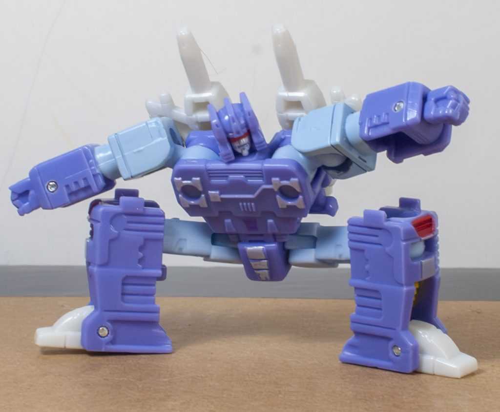 For colors, Rumble’s actually more purple than blue, like his animation model. Specifically, it’s a light purple, with powdery blue on his limbs. There’s some good paintwork on him, including accents of silver, yellow and red. In particular, they managed to tampograph a teeny, tiny purple Decepticon symbol on his stomach, because it’s there on the animation model. Same with his red visor and silver face, it’s very intricate in person. I bet some of that Core budget went into all of this paintwork. For build quality, he’s also nice and solid and stable, all the joints are tight, and his big feet make him stand well.