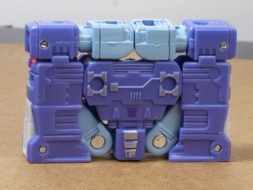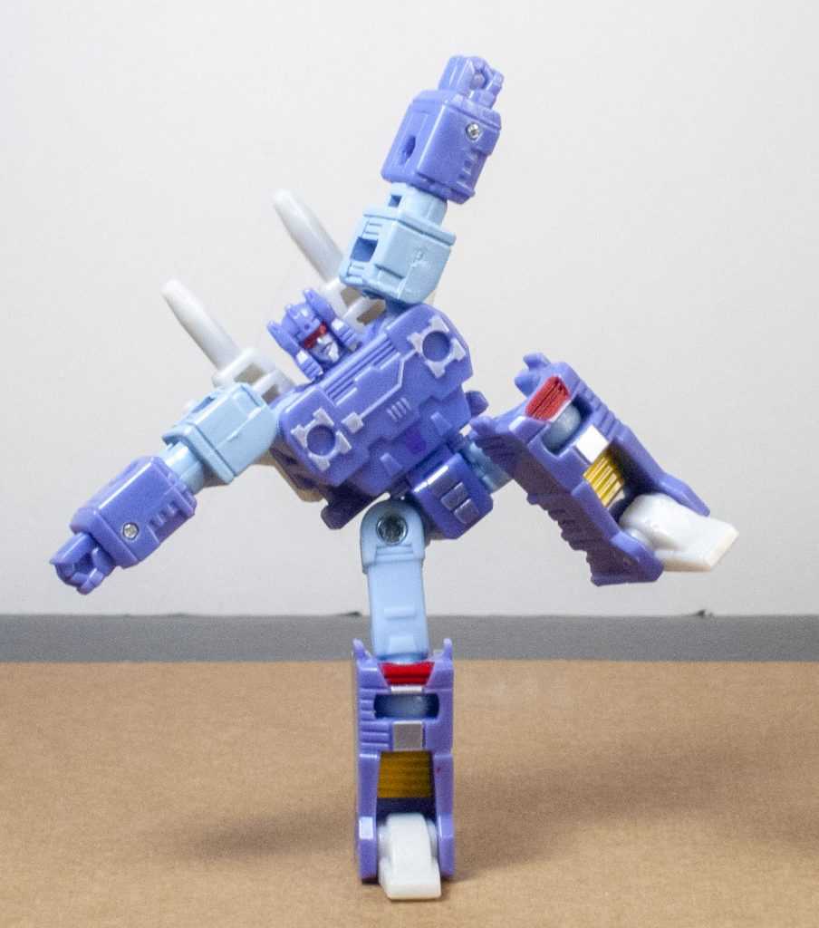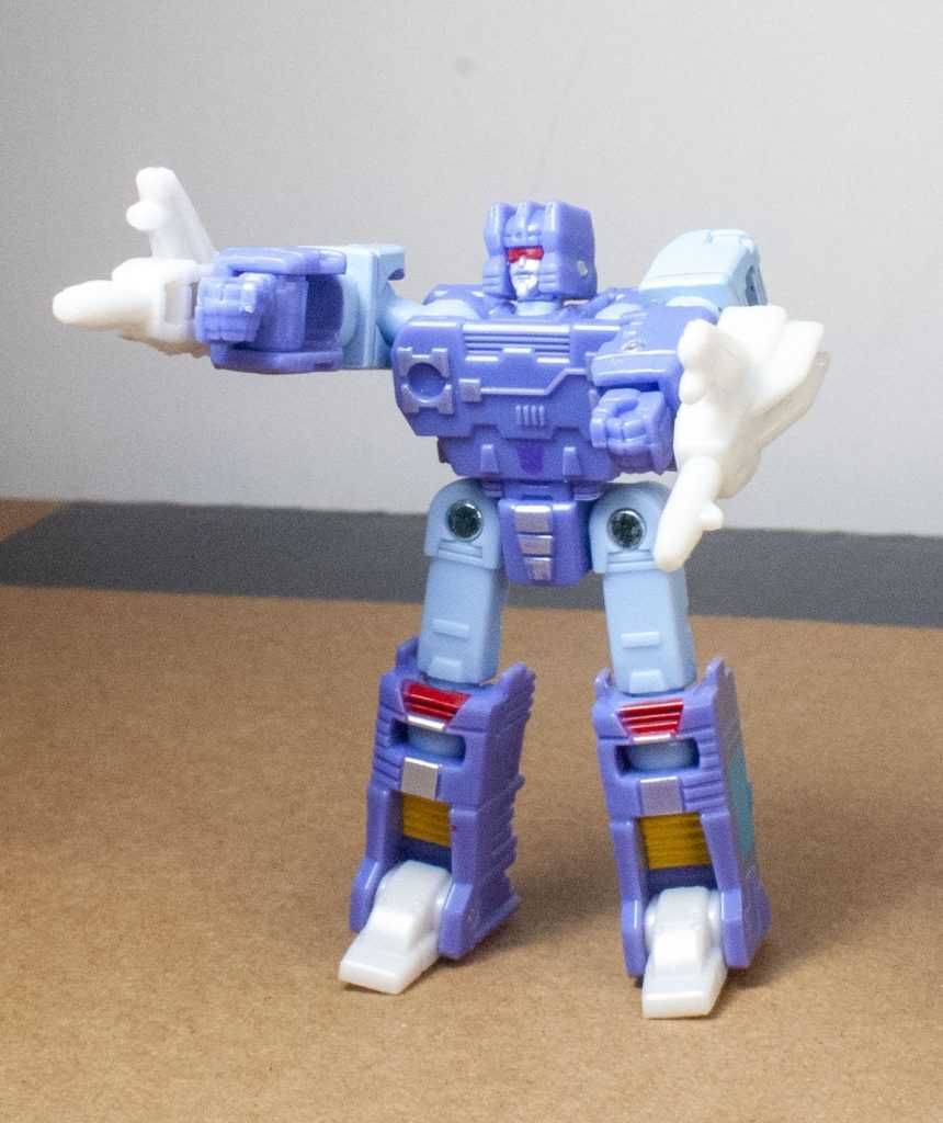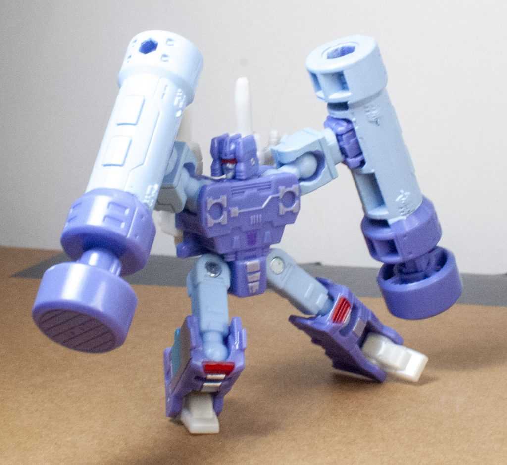For colors, Rumble’s actually more purple than blue, like his animation model. Specifically, it’s a light purple, with powdery blue on his limbs. There’s some good paintwork on him, including accents of silver, yellow and red. In particular, they managed to tampograph a teeny, tiny purple Decepticon symbol on his stomach, because it’s there on the animation model. Same with his red visor and silver face, it’s very intricate in person. I bet some of that Core budget went into all of this paintwork. For build quality, he’s also nice and solid and stable, all the joints are tight, and his big feet make him stand well.