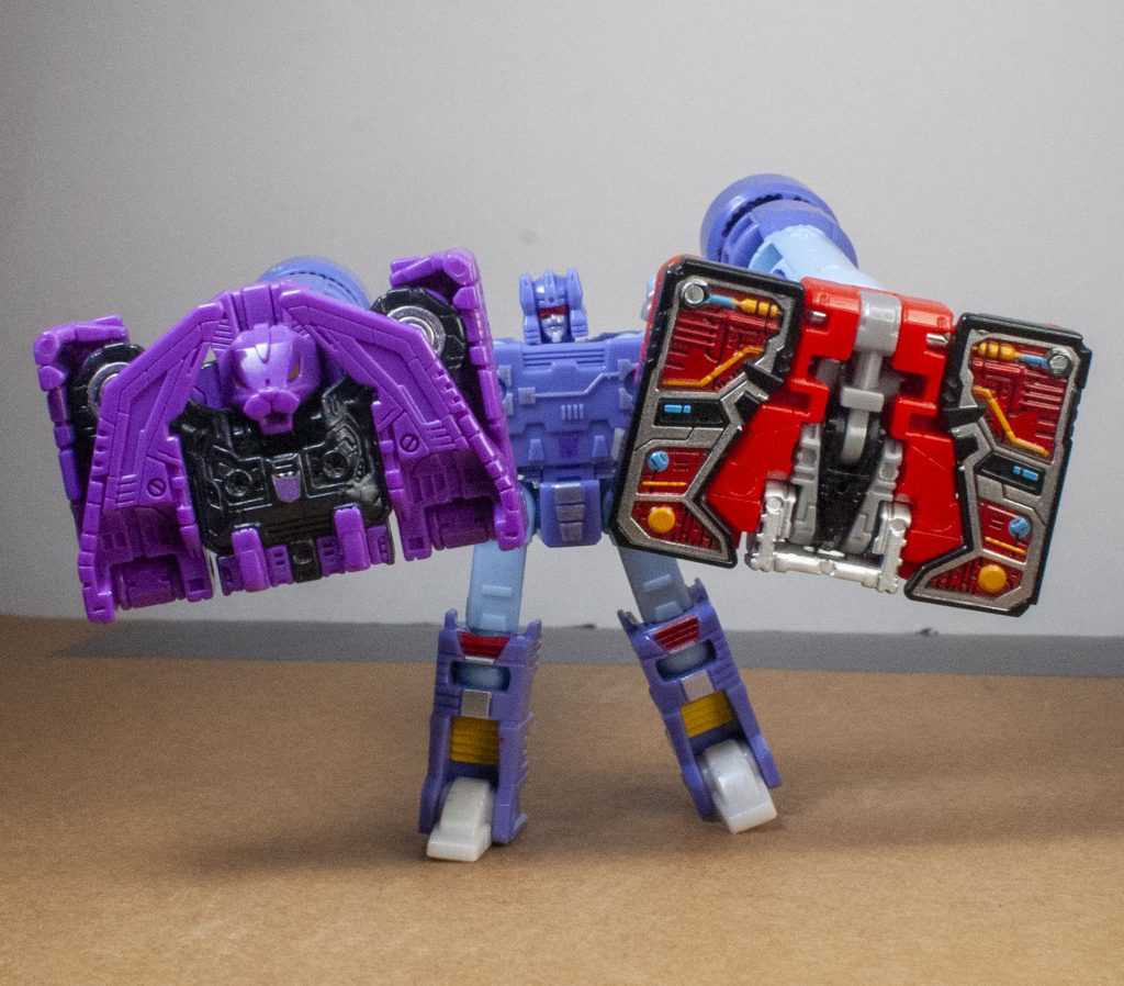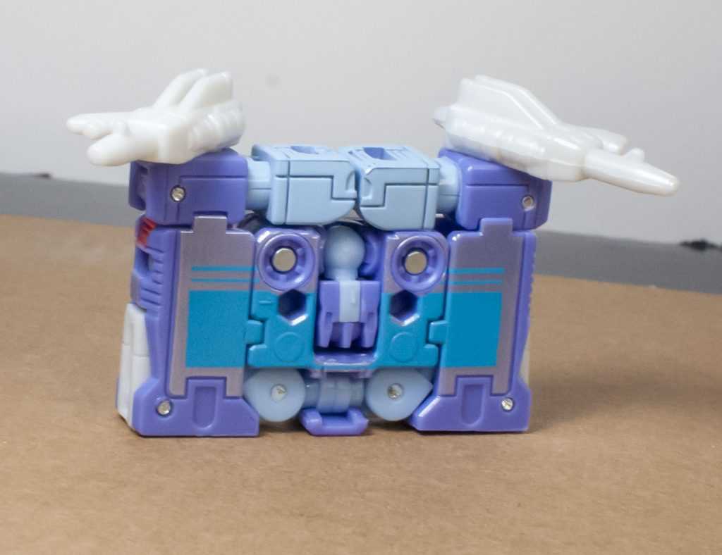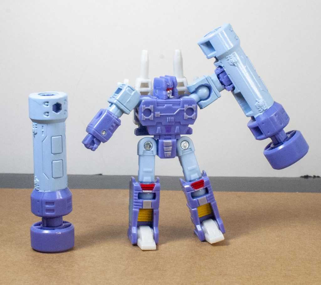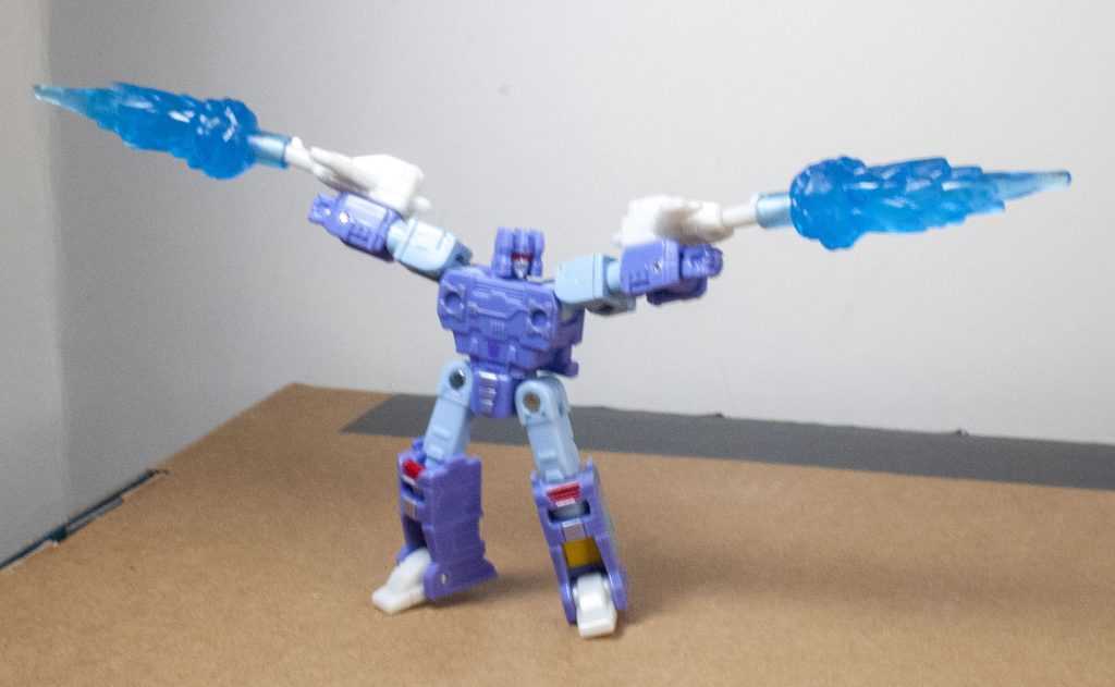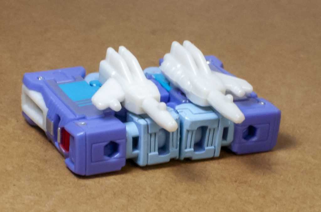 They’re each two-tone, mostly colored light blue, with purple towards the front of them, and on the heads of the things. They look good from most angles, but each of them also has a single side where they’re extremely hollow, crisscrossed like a honeycomb, though there’s at least tech detailing in the hollow bits. And for something that’s supposed to make the increased price feel worth it, that hollowness is a bit disappointing.
