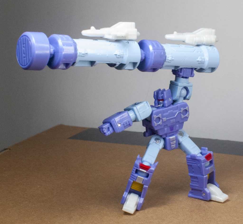 For accessories, this is where the value-add is. Firstly, Rumble’s got his two back-mounted laser…wing…pod…thingies, molded in light gray. I’m glad to see them, because they complete his silhouette. Strangely, he can’t hold them in his hands, which have no peg holes in them. Instead, you can clip them onto his outer arms.