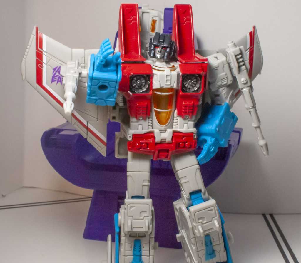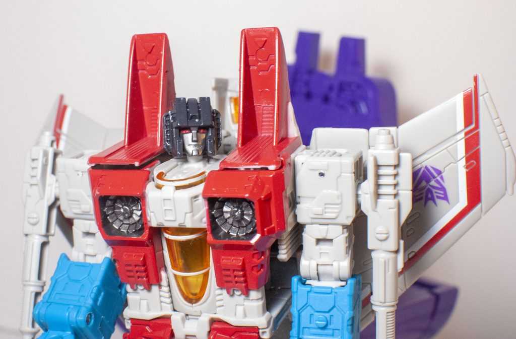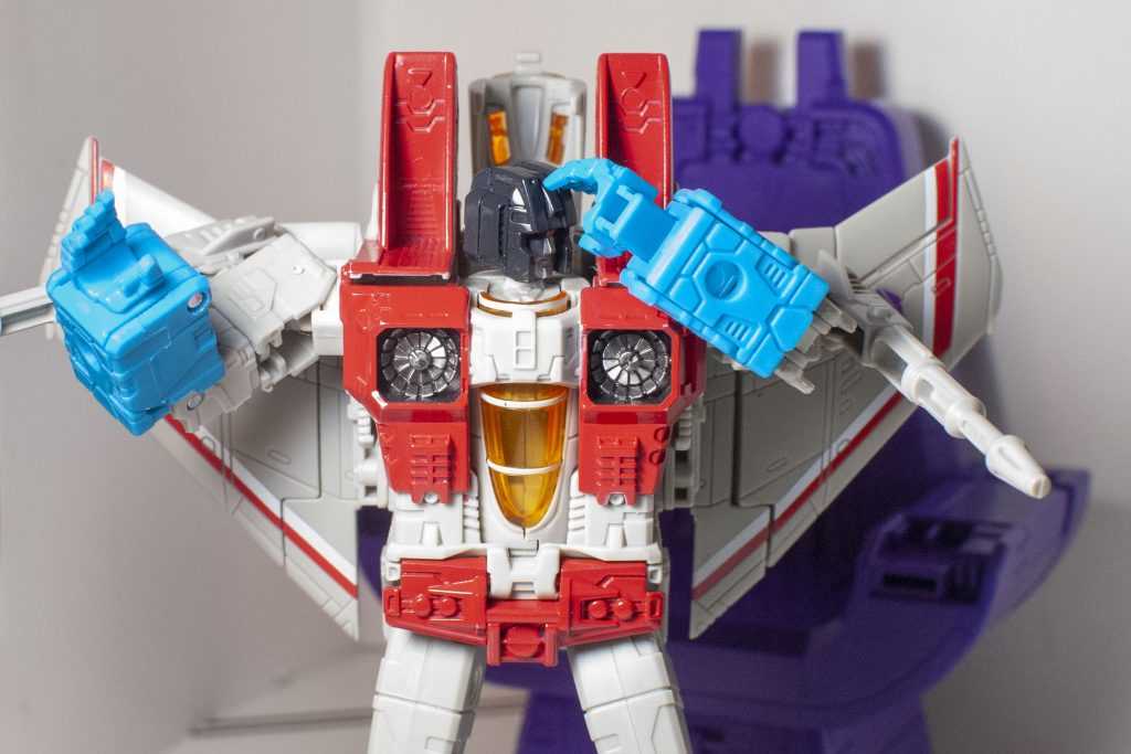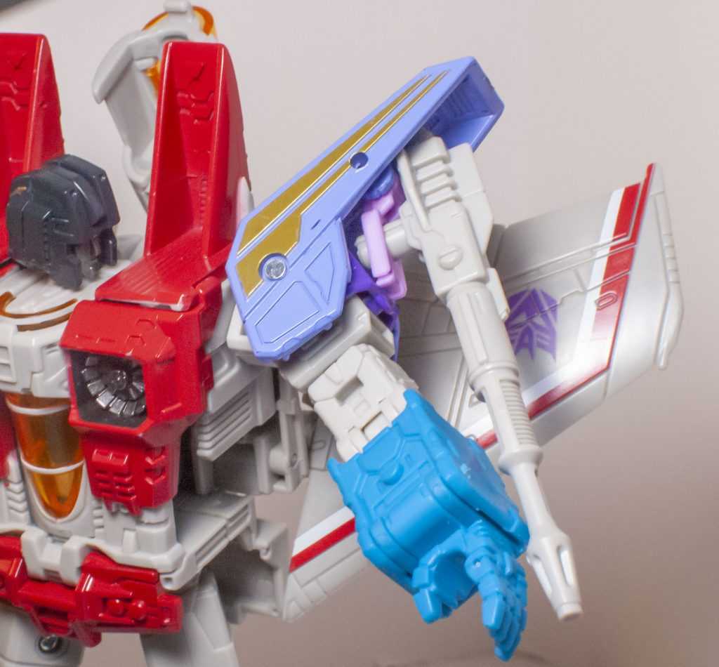 To my surprise, this version of Starscream came out of the box with four whole Null Rays. For the sake of the core figure, it’s the ones with the grey pegs that you want to use. So, yes, at a glance, the figure at the center of this set is basically Earthrise Starscream again, which is to say it’s a G1 Animation Colored version of the old 2006 Classics figure writ large, and with more joints. It’s a figure I liked when it came out in Earthrise, and it’s one I like now. I have a lot of nostalgia for the older Classics Deluxe, and having that with additional ankle tilts, limb swivels, and jointed wings, along with a bunch of other tiny improvements feels great.