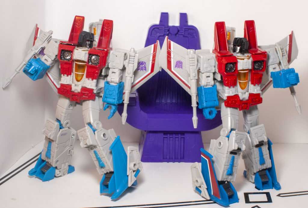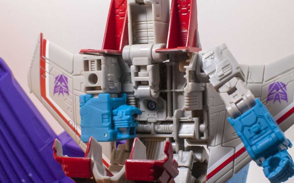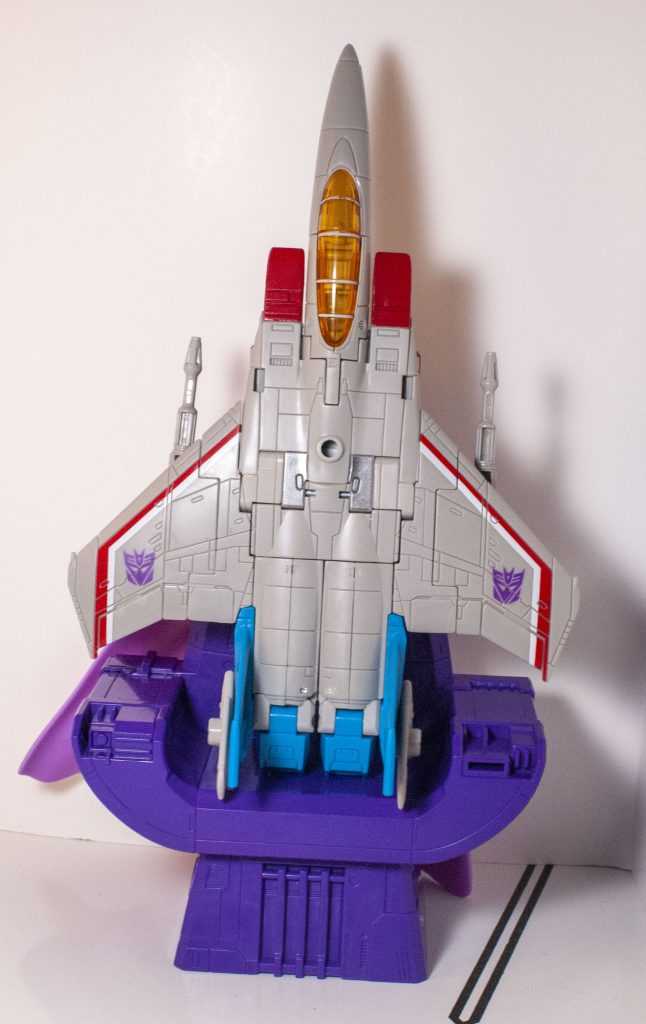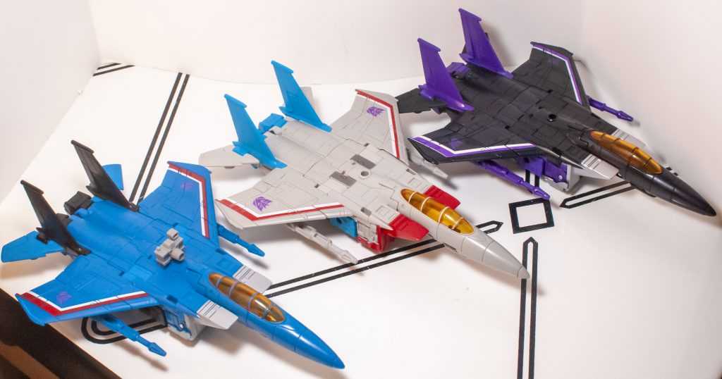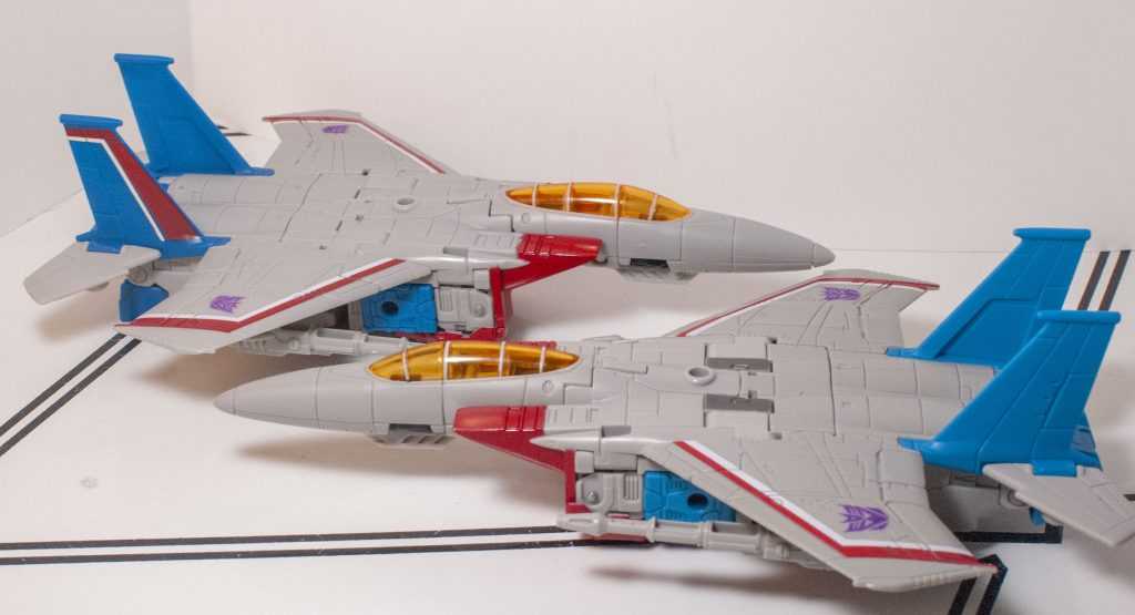 The rest is all tiny changes: The Decepticon logos on his wings are a little bit larger, and he’s missing a little bit of dark grey paint on his shins, and stripes on the wings on the sides of his feet. Other than that, he’s nigh-identical.