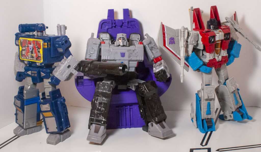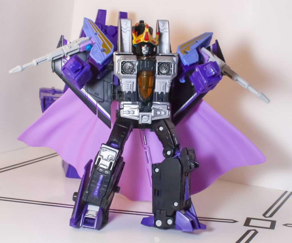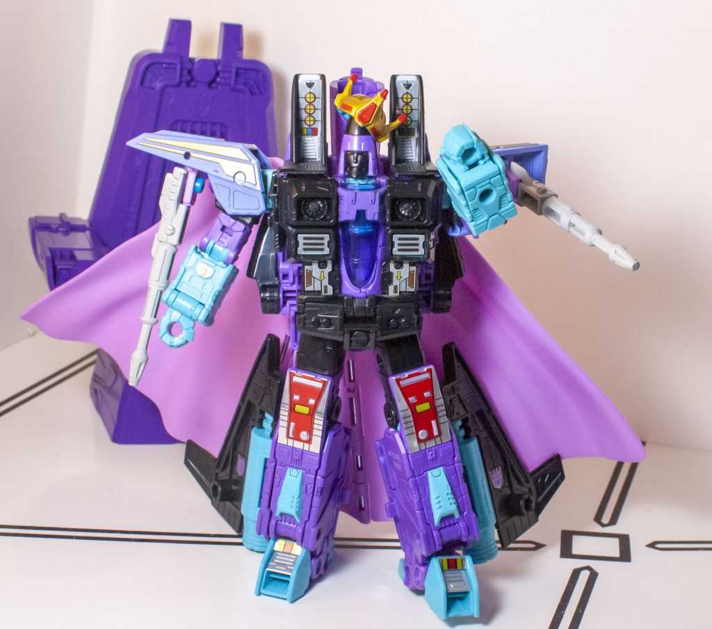 It’s pretty normal as a Transformers collector to wind up with a couple different repaints of the current Seeker tooling. You get Starscream, whichever one of Skywarp or Thundercracker is easier to get, maybe a Conehead, maybe one of the wildcard obscurities they like to throw in. And if you end up getting the same character twice, it’s often in one of their extremely-different variants (Ghost Starscream, Generation 2 Ramjet, Action Master Thundercracker, etc.) But getting a minor variant of the same Seeker, that’s less common. So, why’d I get this guy? I already had Earthrise Starscream (along with a couple other iterations of the tooling), and even did a grand review of him, his Earthrise companions, and the Siege Seekers back in 2020. And now, the Studio Series 86 line’s seen fit to re-release him in a Leader-class box, with accessories to imitate that incredibly extra moment in the ‘86 film when he donned a crown and cape, and was shot and killed for being a don.