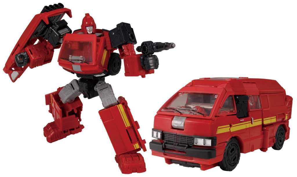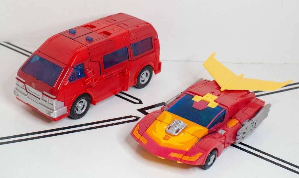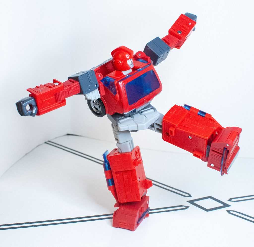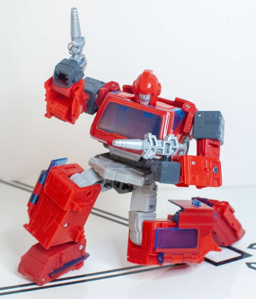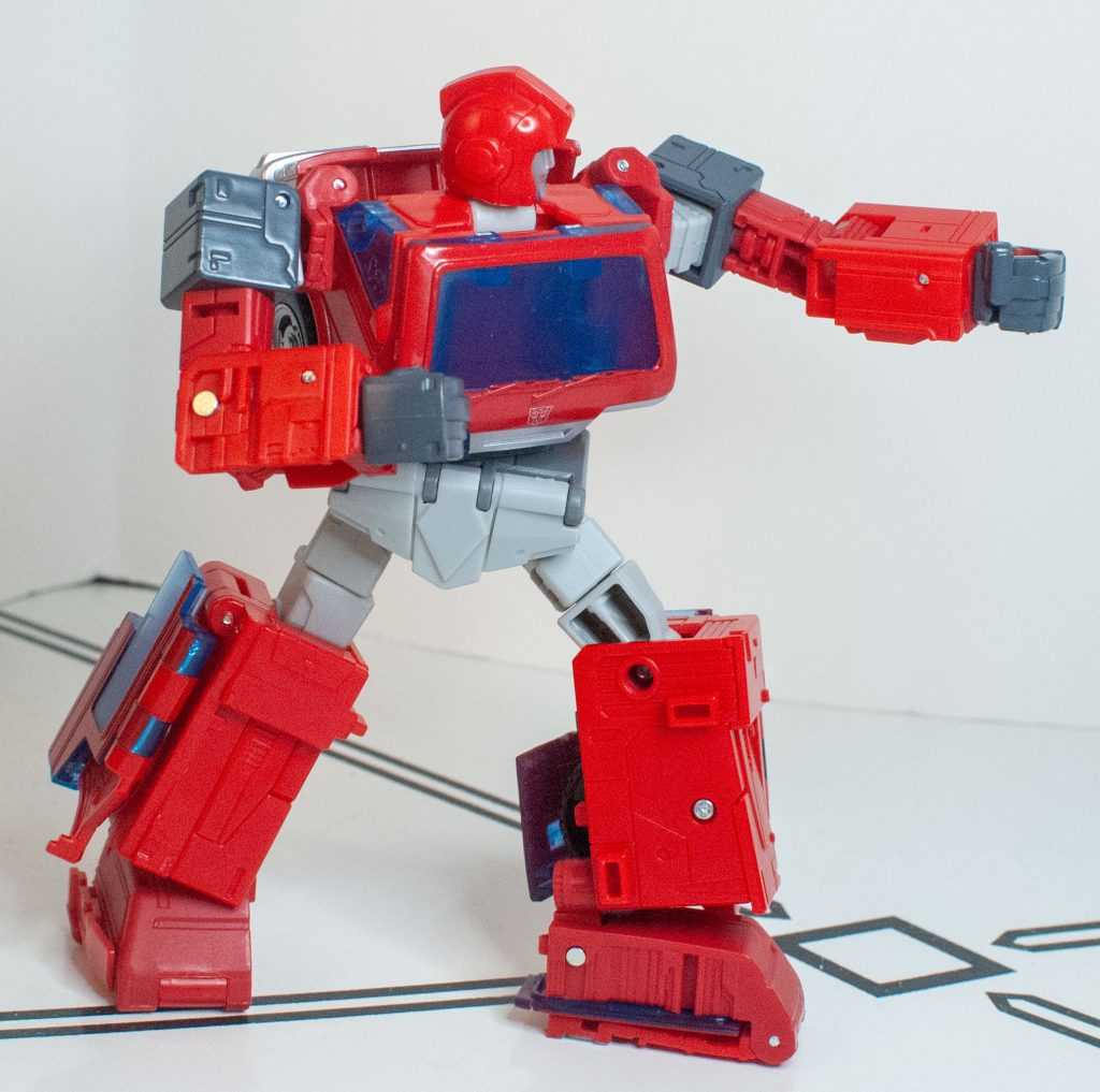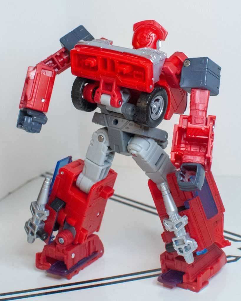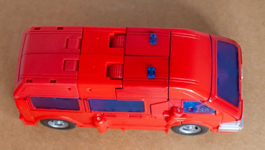 It’s something the Earthrise one even had the budget to include. It’s important, because outside of animation accuracy, it breaks up the sea of red. Add to that the fact that his headlights aren’t colored in (again, Earthrise did it), and that, outside of the bumper, his entire rear segment, including the sculpted windows, are totally unpainted (when the fact that the sculpting was there, instead of feet, was a selling point), and you’ve got a figure that just feels under-painted, to say nothing of the fact that the obvious mismatch in his various reds is a lot more obvious in this form, with different segments of his roof and body being different shades, and varying between glossy and matte colors.