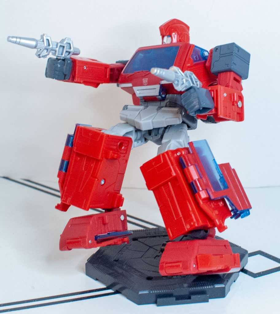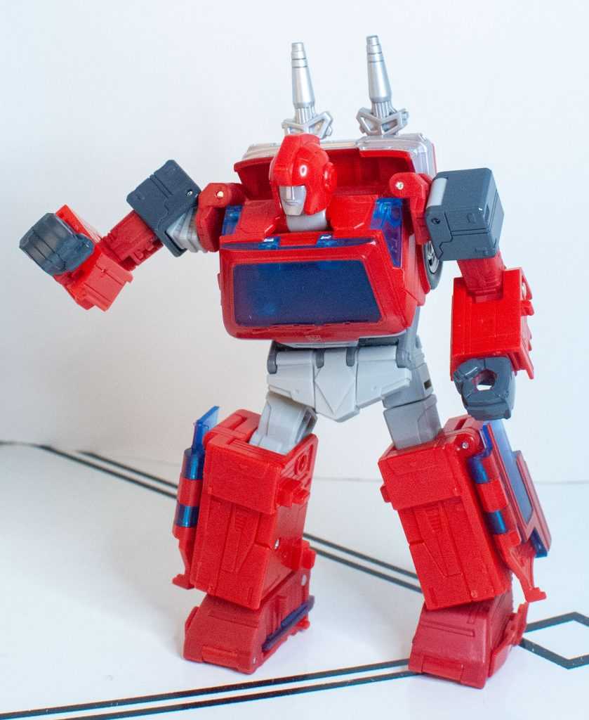 So, on those merits, it looks better than the Earthrise version. On the other hand, I don’t think I’d say that this version looks particularly *good*. He’s crisscrossed on his sides with transformation seams, and there’s these huge, cylinder-shaped joints used to pivot the panels sticking out in multiple places. While it’s marginally less messy than the last one (especially since they managed to give him a full set of transparent blue windows going down the sides), it’s not much of an improvement.