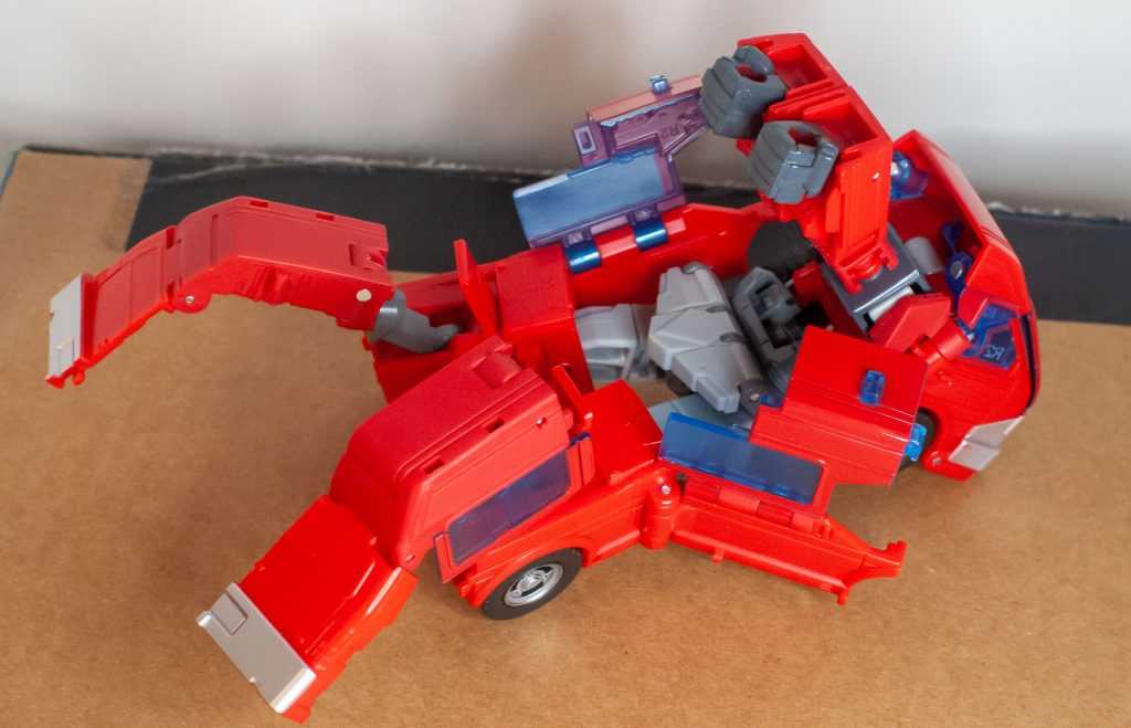 It’s not a totally intuitive transformation, by the midpoint you find yourself struggling with a big spread of un-aligned panels that need popping in, but it’s pretty quickly solvable, and involves a bunch of loud, satisfying snaps. The hardest bit is getting the very front bit of roof (above the windshield) to plug into the next section, it’s on a pair of translucent pegs that are extremely thick (presumably because of that translucence), and it takes worrying amounts of force to get in as a result.