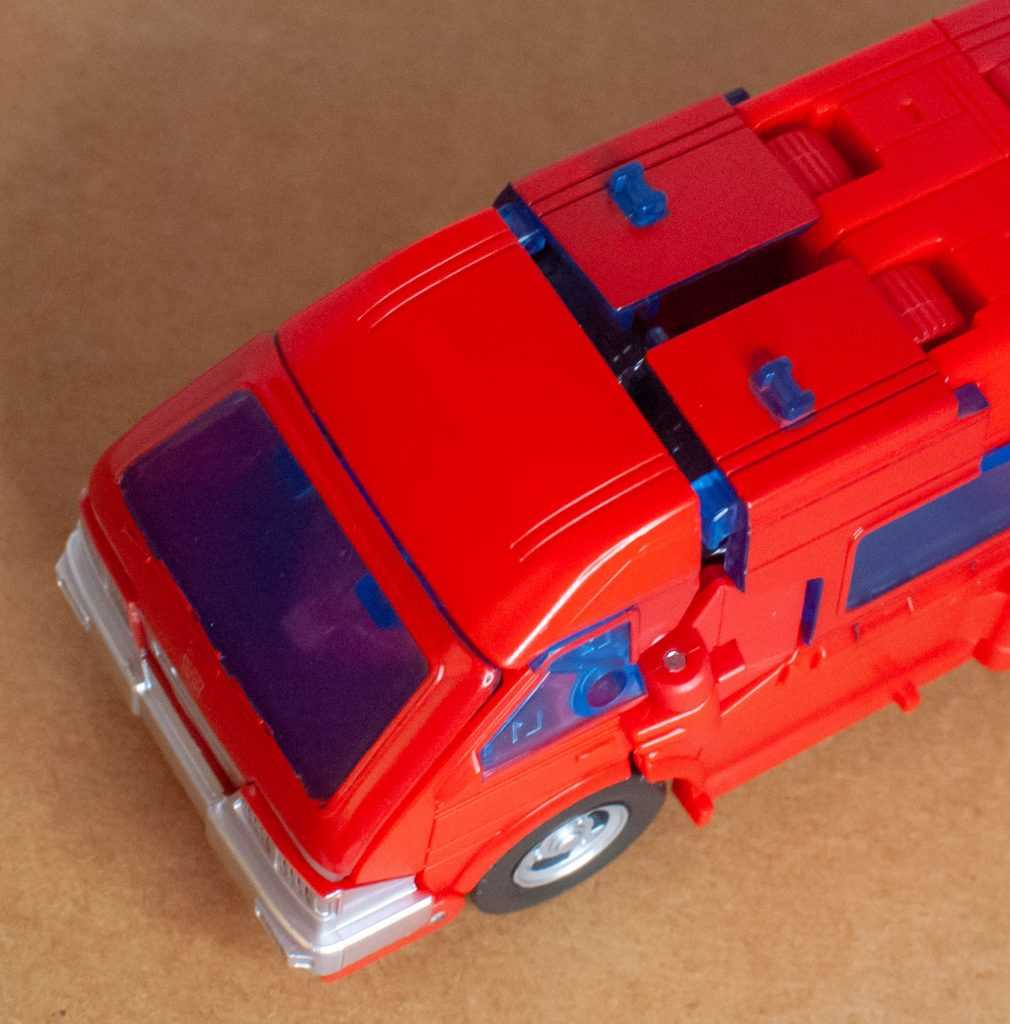 Uptop, meanwhile outside of transformation seams and joints, he’s got a pair of clear blue projections, which most people have clocked as a mounting point for an ambulance light bar on the inevitable Ratchet retool. The fact that they left the nubs in, instead of tooling those panels differently, is a disappointment, especially considering they’re incredibly visible right there on top of him.