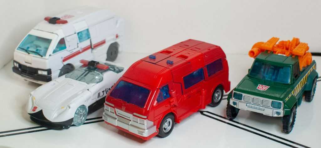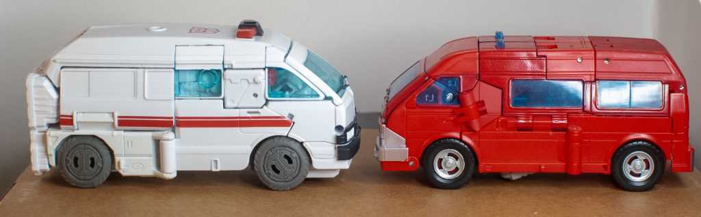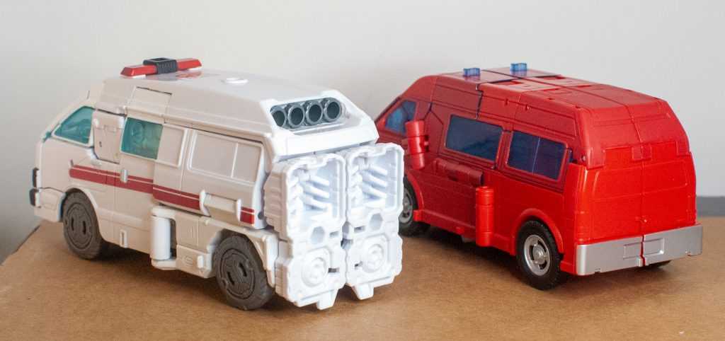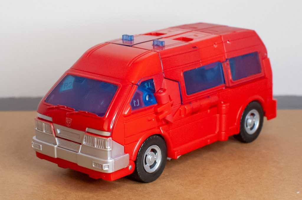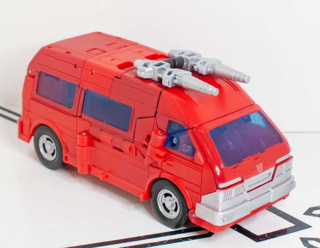 Well, Ironhide still changes into a big (but still only Deluxe-sized) red van, and it’s one that technically fulfills the mission brief of fixing the Earthrise one’s two biggest problems. On the positive side, this version has proper, Earthly wheels with tires (and painted rims!), and actually has a properly sculpted back end that isn’t just robot-mode feet.