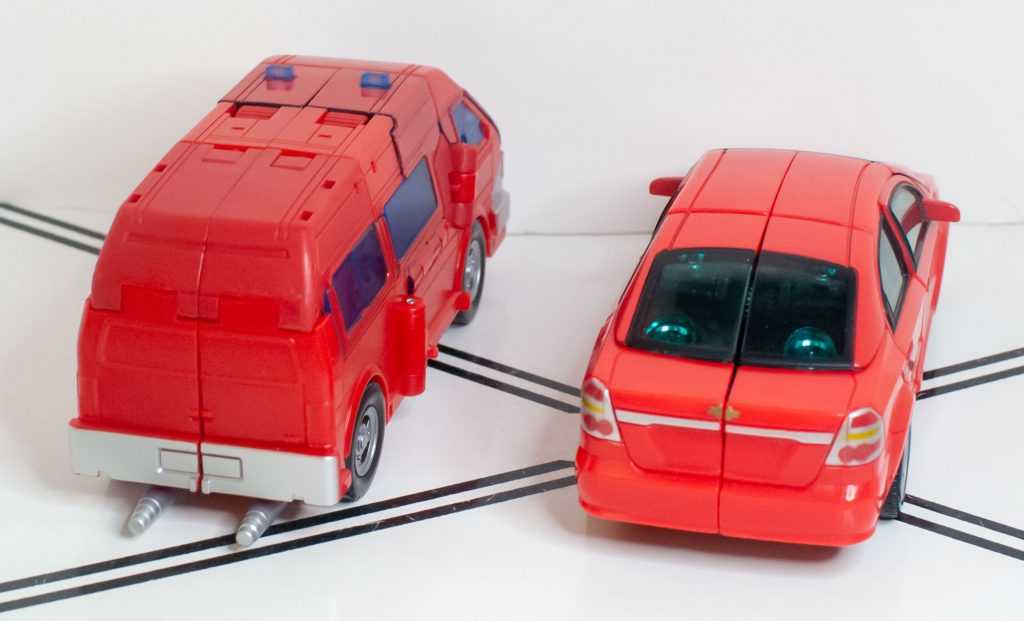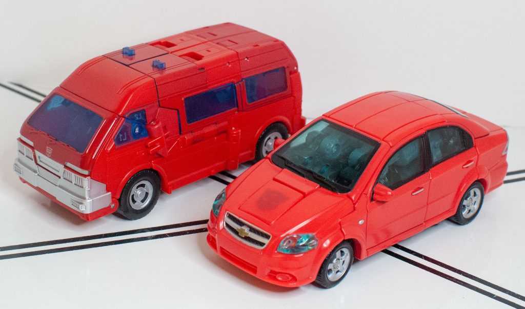 On the positive side, the mess is only visual, he feels great to handle. Everything fits together really nicely, and he comes together into a solid brick-shaped hunk of plastic (even if the sculpt is less-than-hunky). There’s an odd similarity I get here: When you pick him up, his wheels rattle with an almost model-kit-like sound. Combine that with his red colors, and the silver painted over it, and the vehicle mode almost feels the same as Chevrolet Aveo Swerve in my hands, a strange thing to be thinking of.