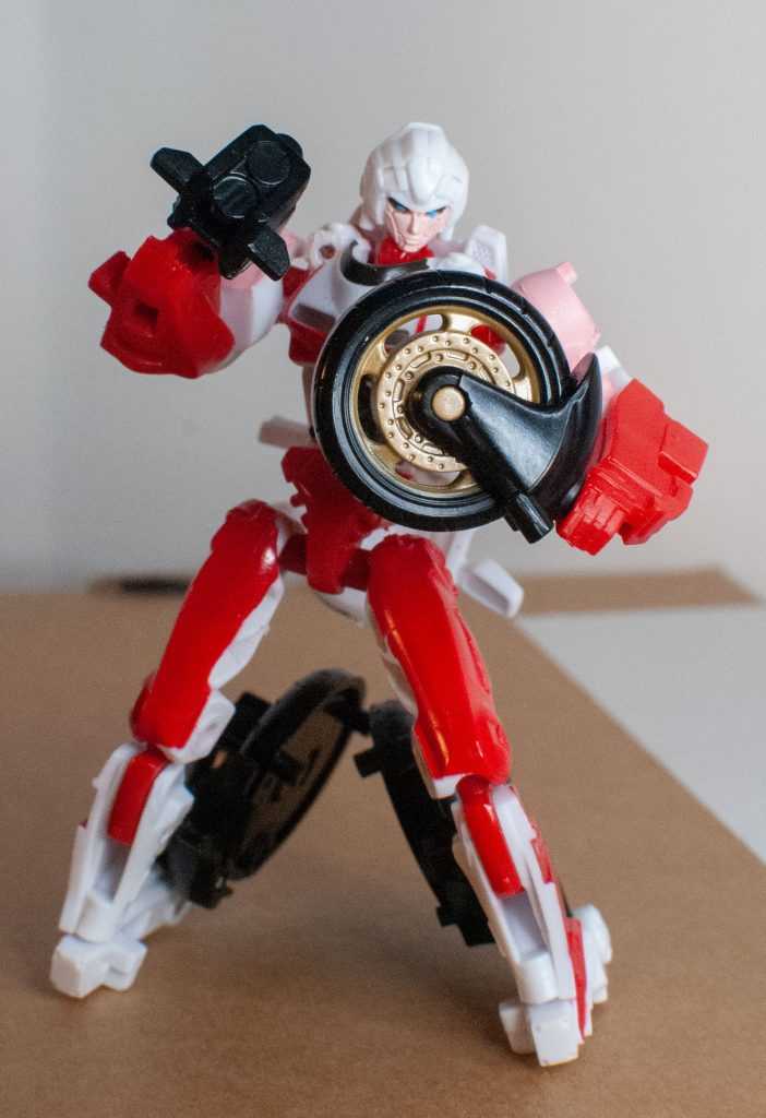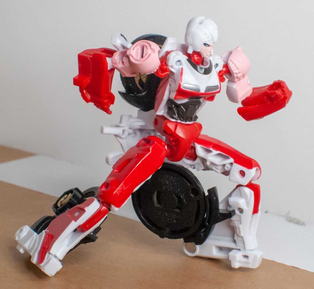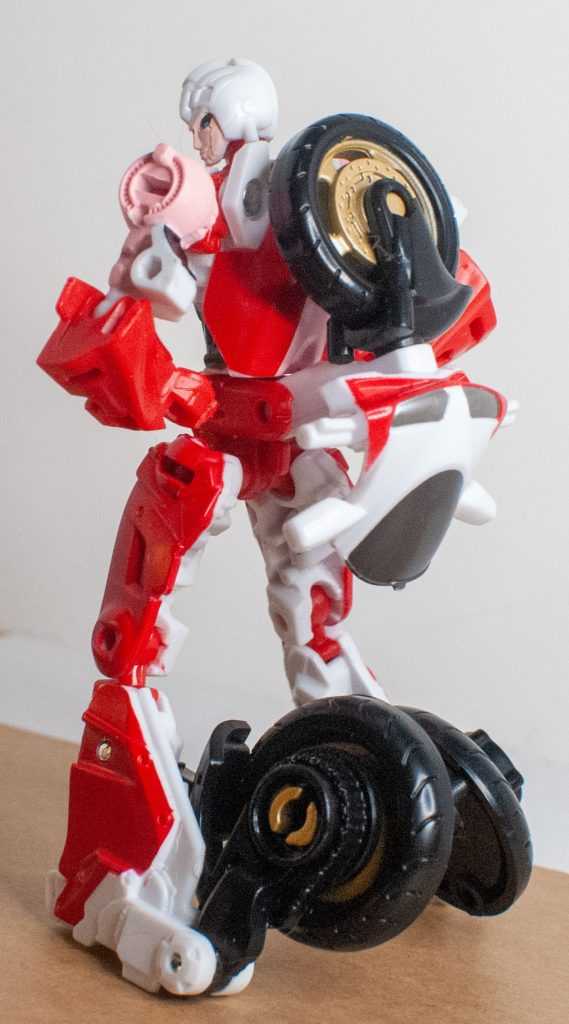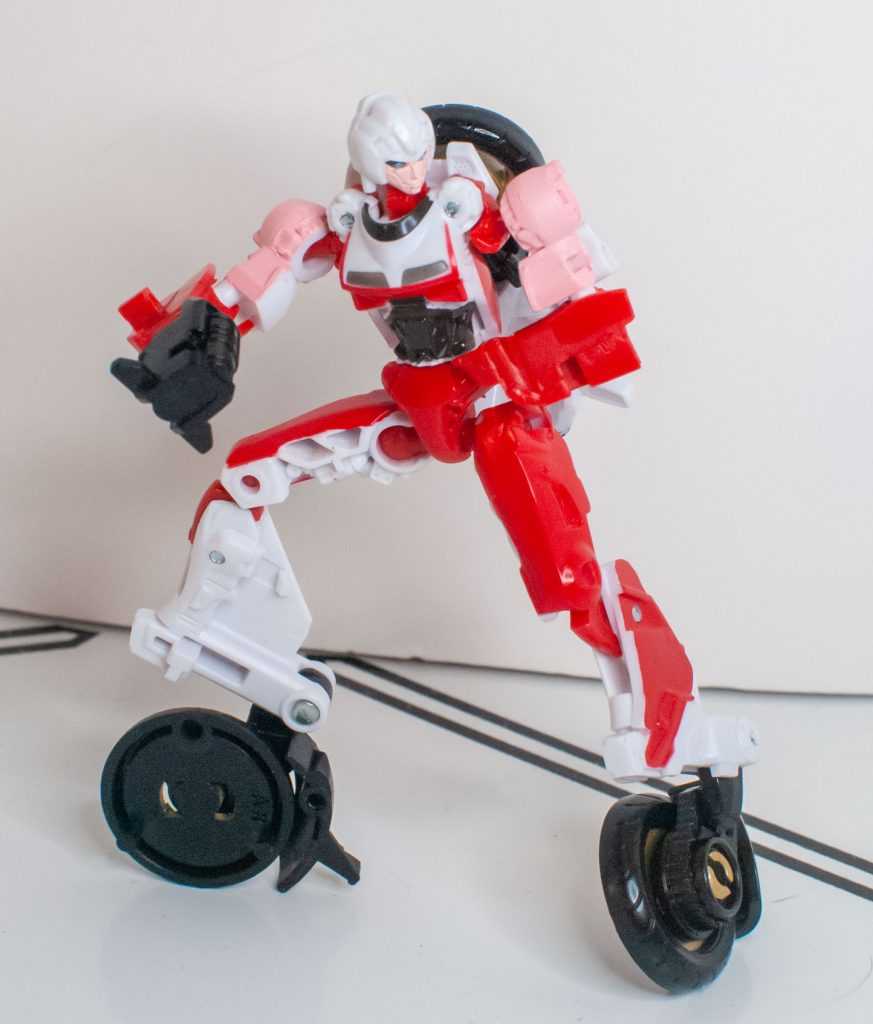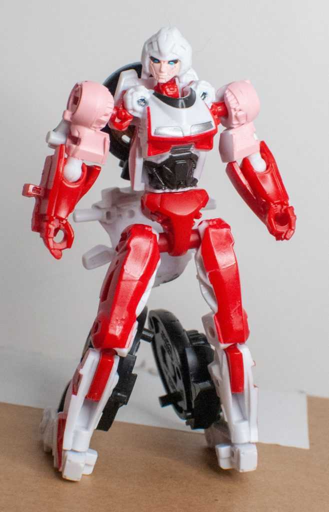 Arcee’s slick-looking, athletic robot from the front. Between the headsculpt and wheels on the backs of her legs, it’s like someone took a shrink-ray to her Bee movie design (reviewed here), which gives it a good sense of character continuity.