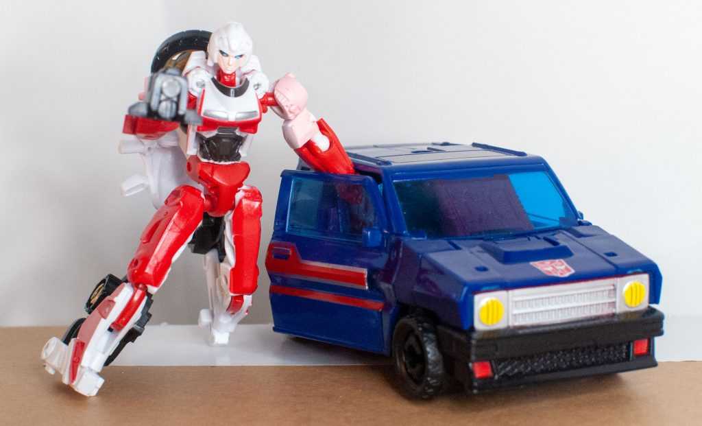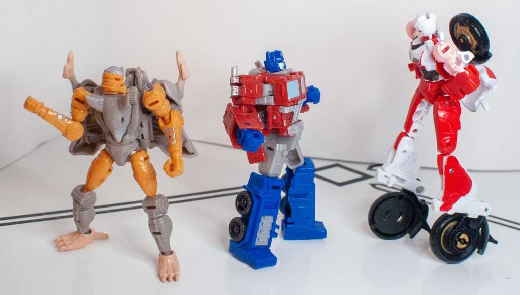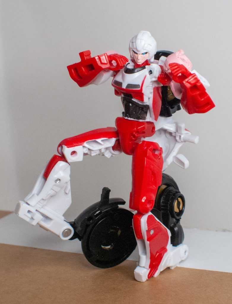 For features, while it’s not called out in the instructions, you can flip Arcee’s wheels out for a rolling mode. It makes her very tall.