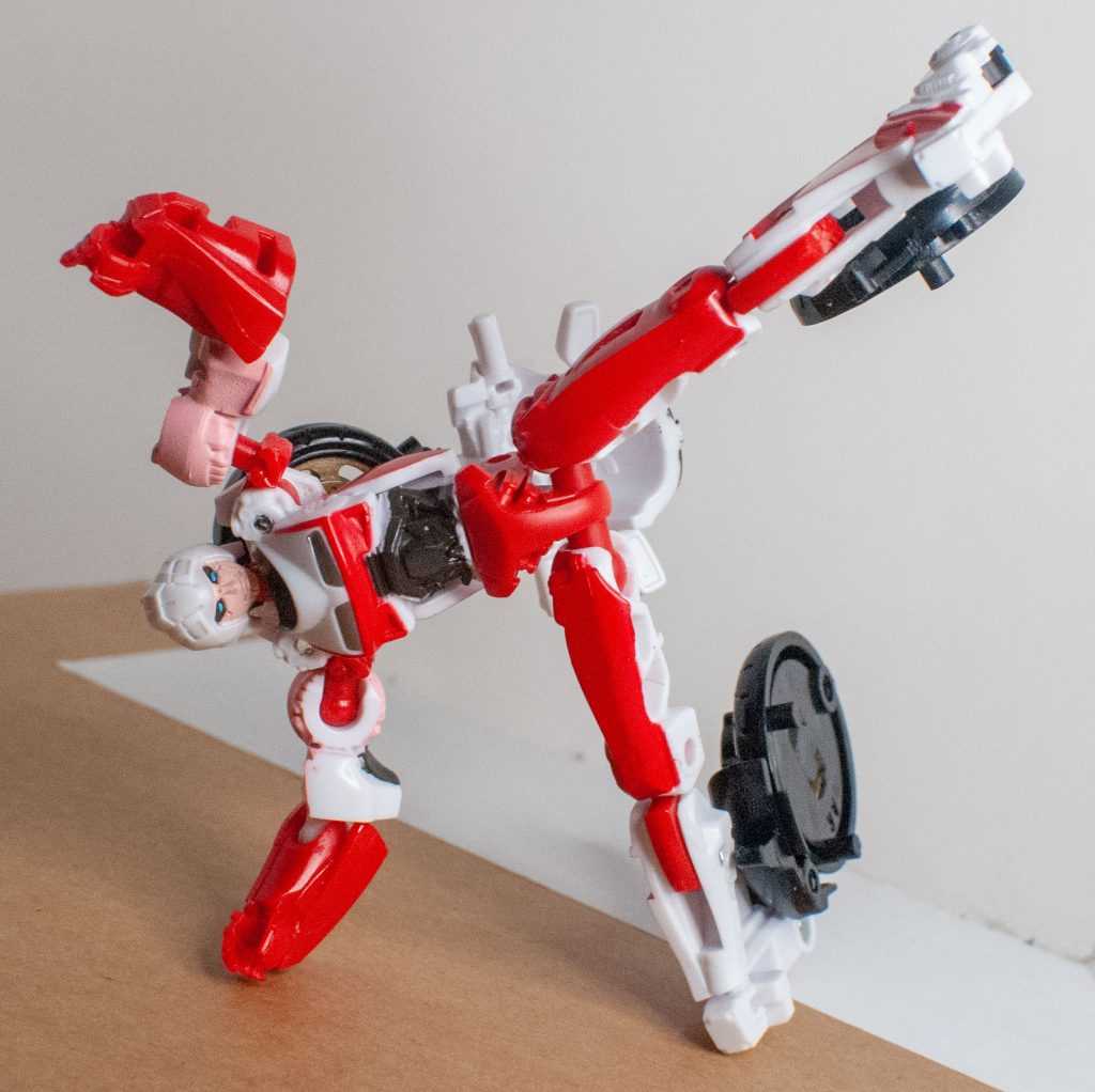 And, impressively, wile it takes a bit more doing than her normal form, she can stay standing on her wheels, somehow!