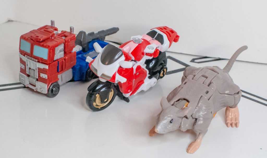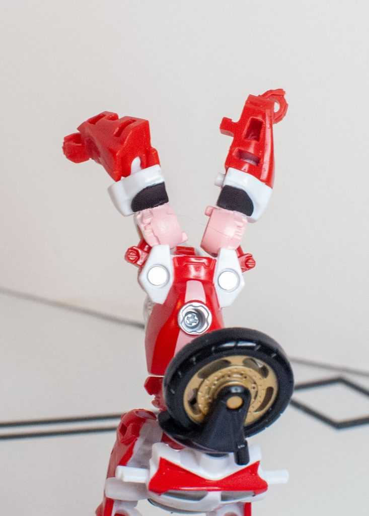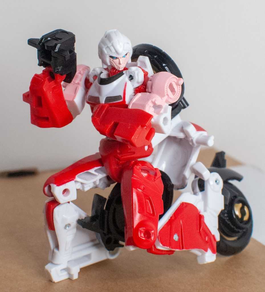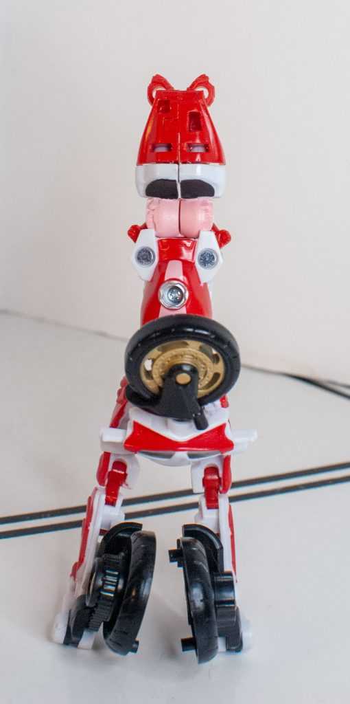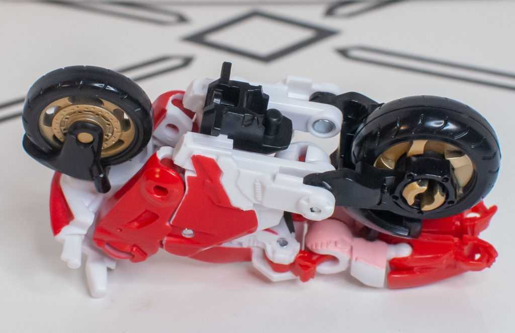 Based on the singular photo we’ve seen of her altmode, screen-accuracy is about what’s plausible for the scale. Which is to say, the front end and wheels are nicely accurate (save for a visible mushroom peg at the back), but most of the rest of the details wind up looking different, by necessity of the transformation. But on its own merits, it looks pretty bike-like.