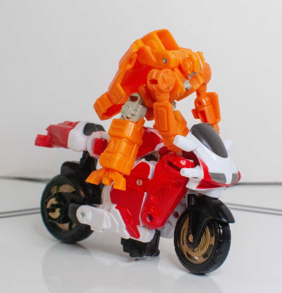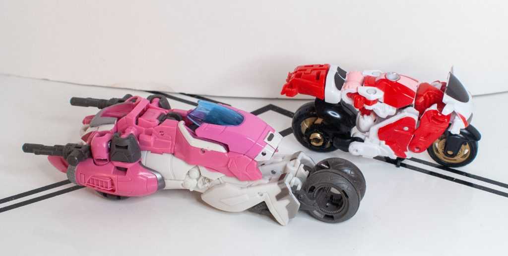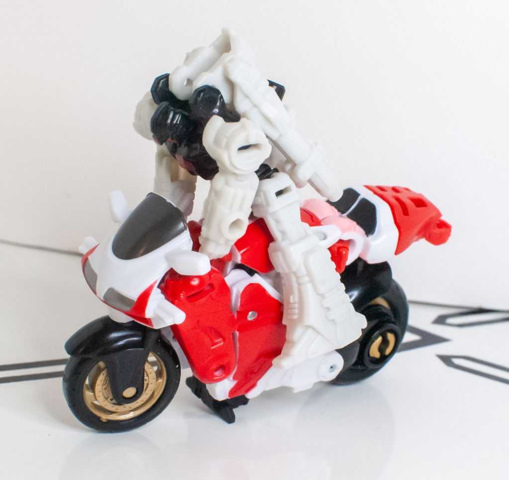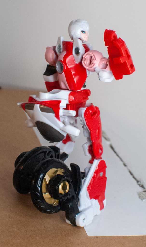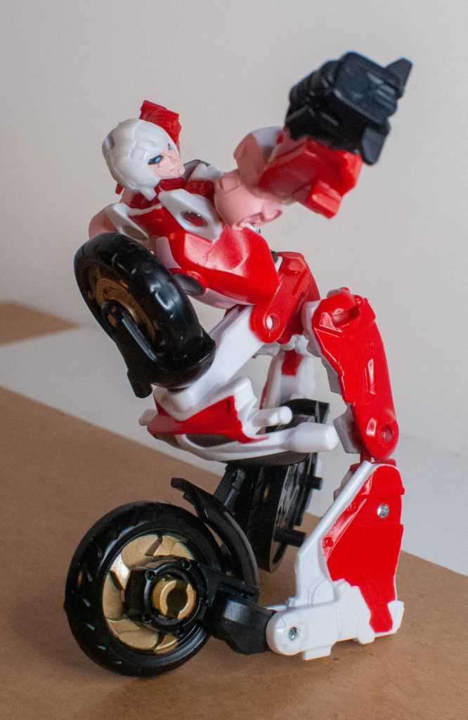 Arcee changes into a tiny little motorcycle that tries not to look like a folded up humanoid robot, and to her credit, it mostly works.