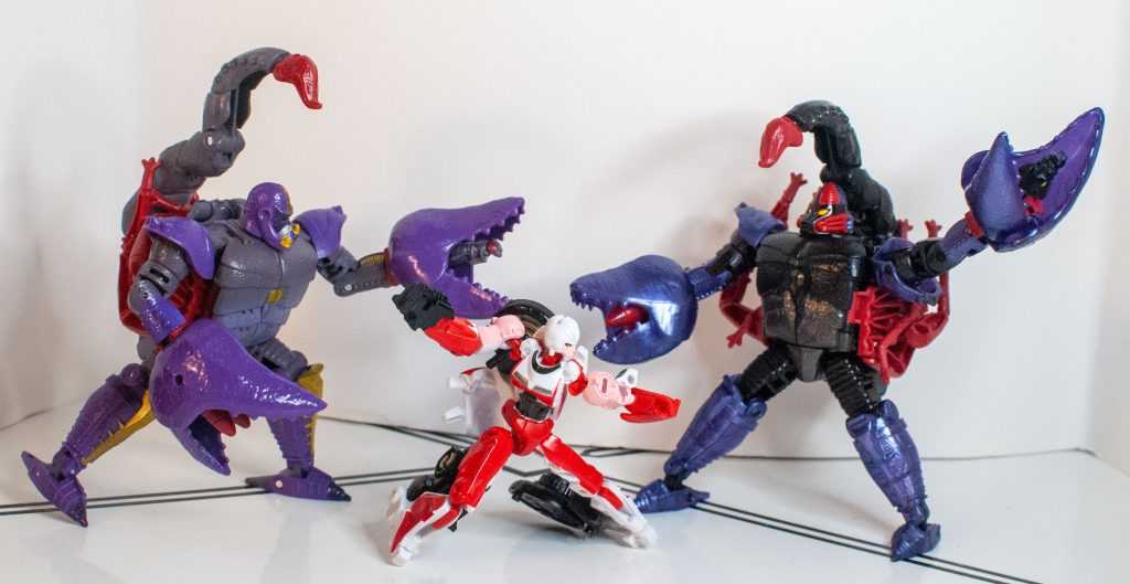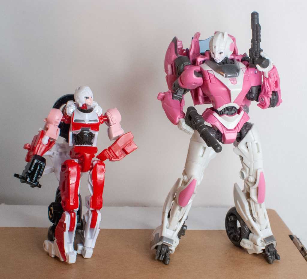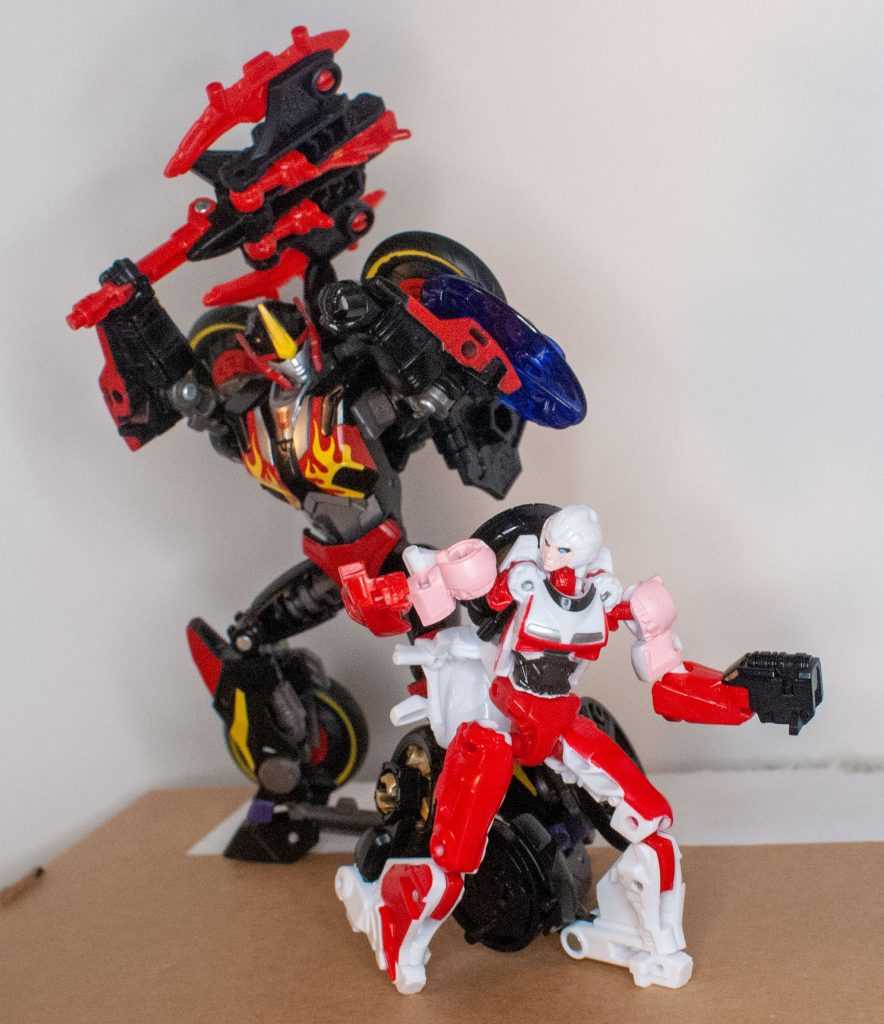 This version of Arcee’s got way more good than bad, but she’s not quite the star I’d hoped it would be. The colors and sculpting are really nice in both modes, and she’s stable enough to pull off a lot of poses. But her backpack really brings the whole thing down, and even if it couldn’t be reduced in size (partscount and budget being what it is) I wish it could peg in or something, so the whole thing would feel a bit more stable. And the transformation, while mostly good, took me forever to figure out, thanks to how specific the connection on her arms has to be. At least it makes for a good-looking bike (funky, non-rideable scale aside).