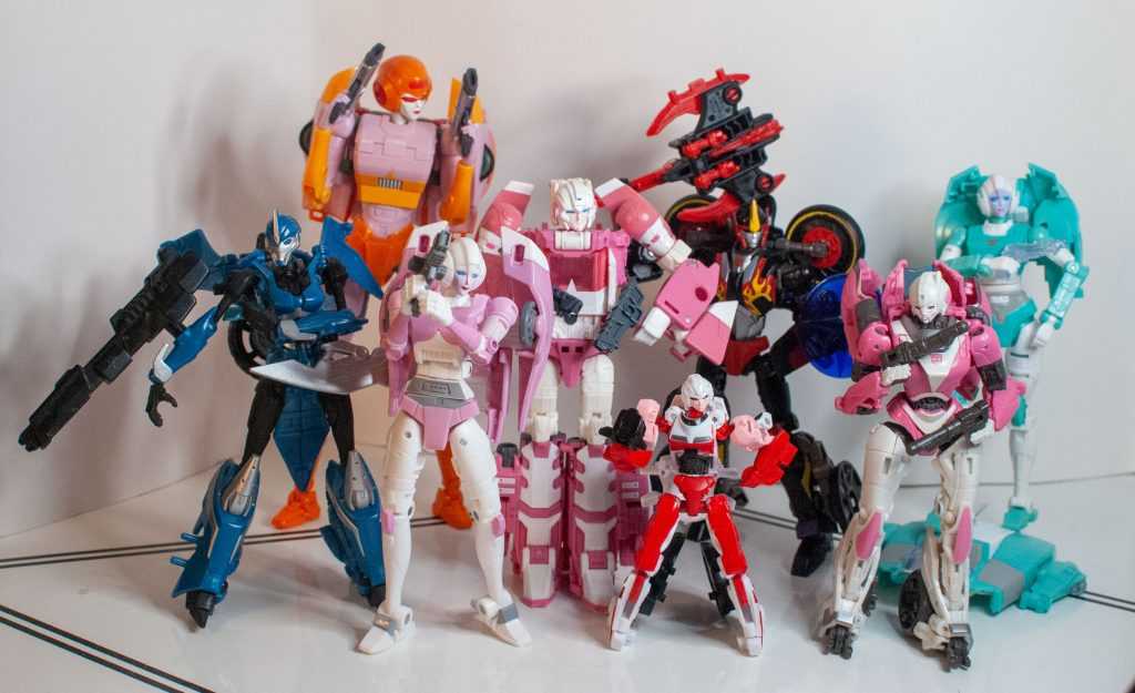 Her colors are interesting, and it seems like she has a lot of paint apps, especially for a Studio Series figure. She’s got light pastel pink, and white, the typical Arcee colors, but she’s mostly a deeper shade of red, which makes me think more of Arcee’s Dark Cybertron-era IDW design, a neat thing to reference.