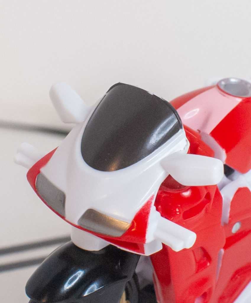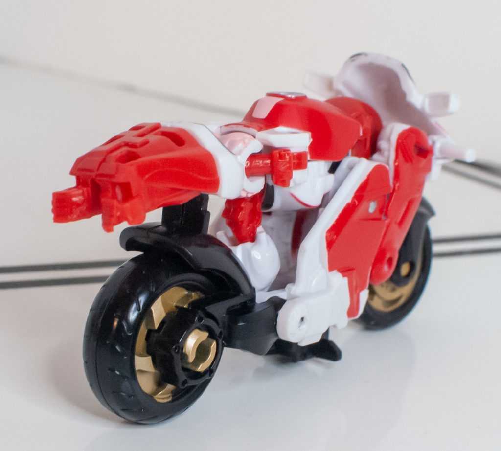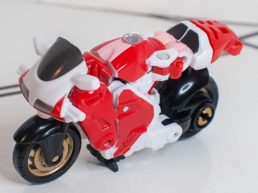 The colors are also largely the same, maybe with a bit more red, and some dark metallic gray for her opaque windscreen. Most impressively, her wheel rims are painted a nice-looking gold, it really adds to the whole look.