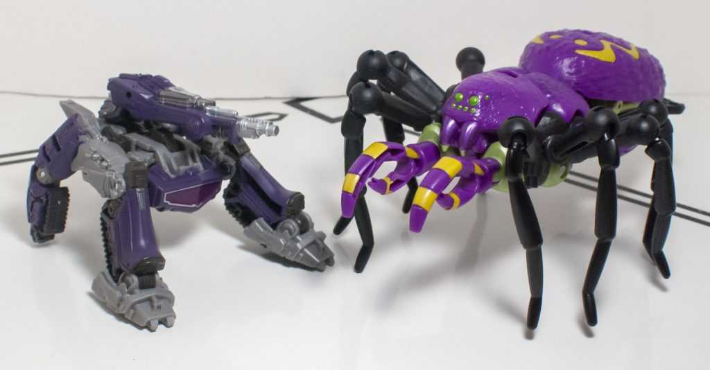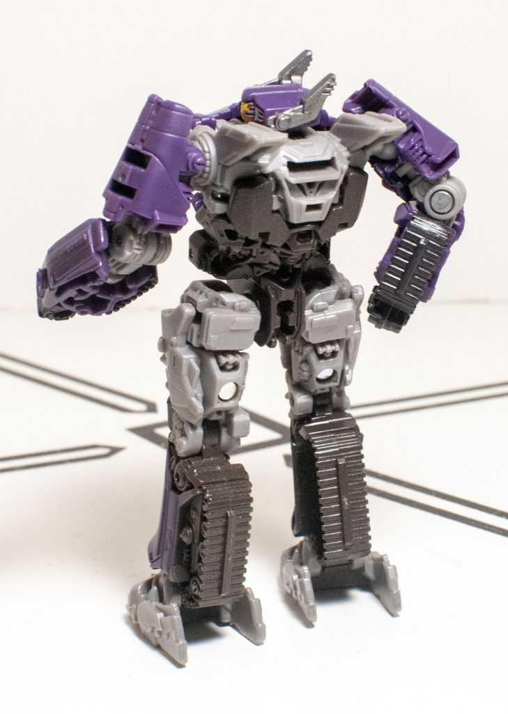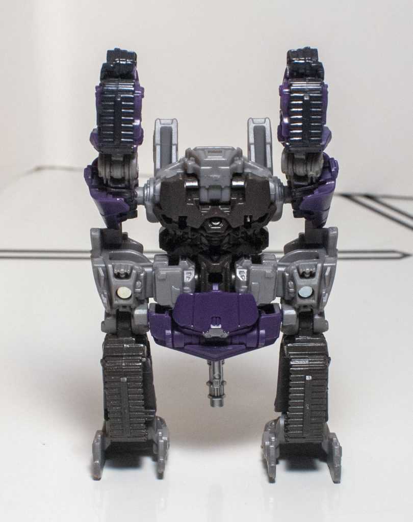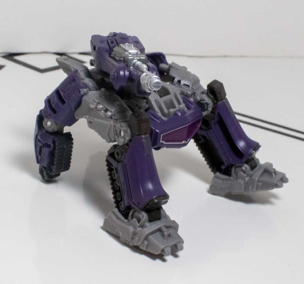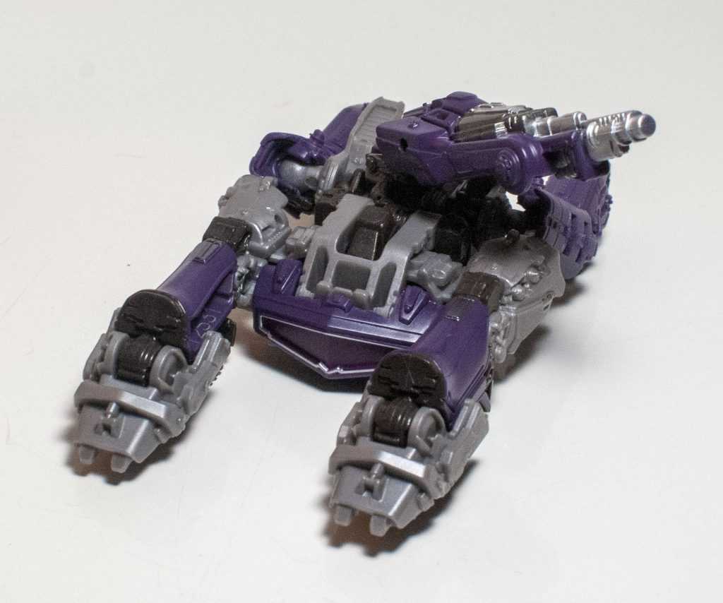 There’s no attempt at wheels, so he can’t roll, you just look at the sculpted treads and wheels, and imagine. Or, if you like, just de-transform his legs, and turn him into a fairly convincing, Cyberverse-Shockwave-esque Spider-Tank.