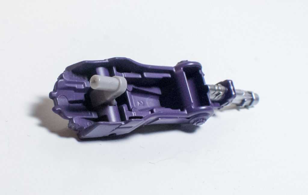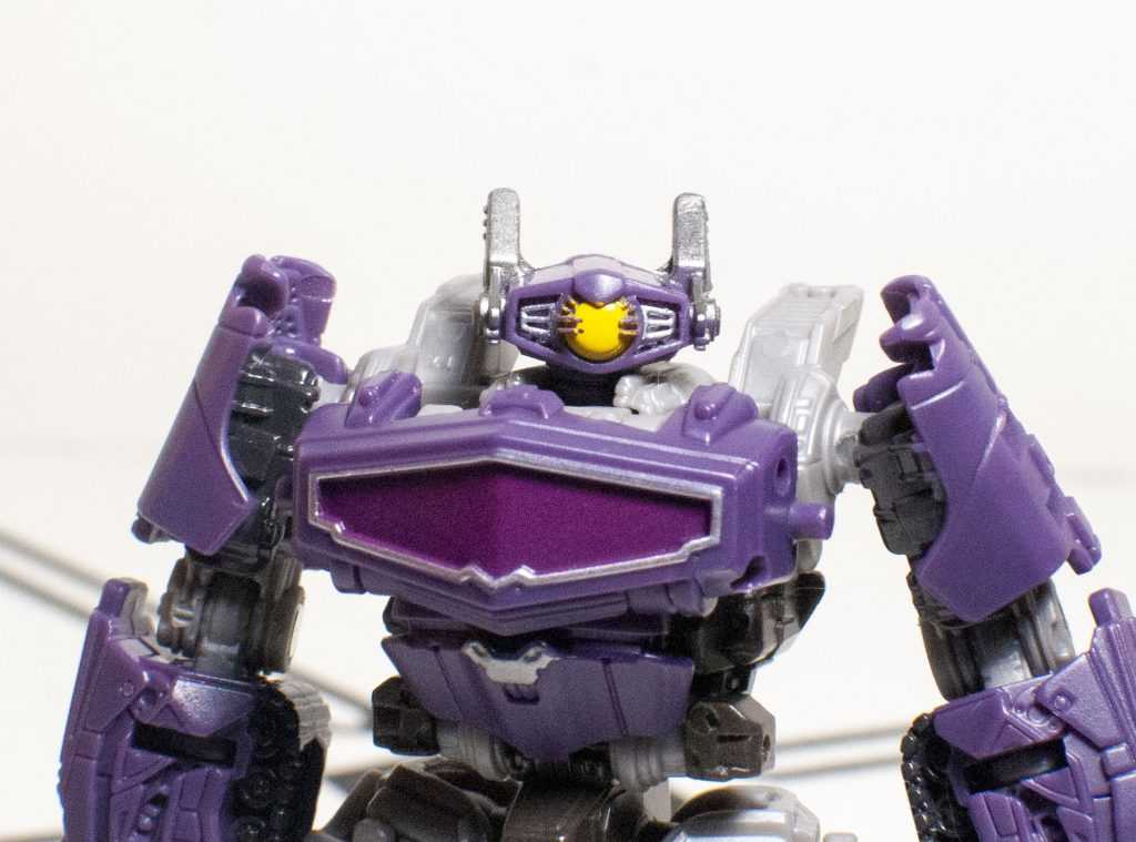 His colors are similarly typical, boilerplate Shockwave: He’s cast in purple and grey, with painted accents of silver, black, and a lighter purple, plus a big yellow eye. That eye’s seemingly a magnet for quality control issues, I thumbed through a full peg of these guys at the shop, and not a single one had the yellow paint applied evenly, they all had some kind of problem. I settled for one with a tiny paint chip, I’ll just Gundam-marker over it once my photos are done.